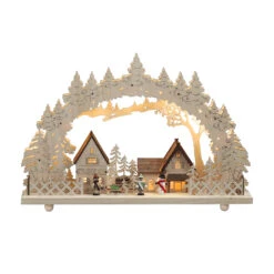Mit diesem schönen Lichterbogen im Fenster entsteht zum einen eine gemütliche Atmosphäre im Raum, zum anderen wirkt das Haus – von außen betrachtet – besonders behaglich und einladend. Die Dorfszene aus naturfarbenem Holz wird von 10 LEDs mit warmweißem Licht in Szene gesetzt. Funktion wahlweise mit Trafo oder Batterie. Batterie nicht im Lieferumfang enthalten.