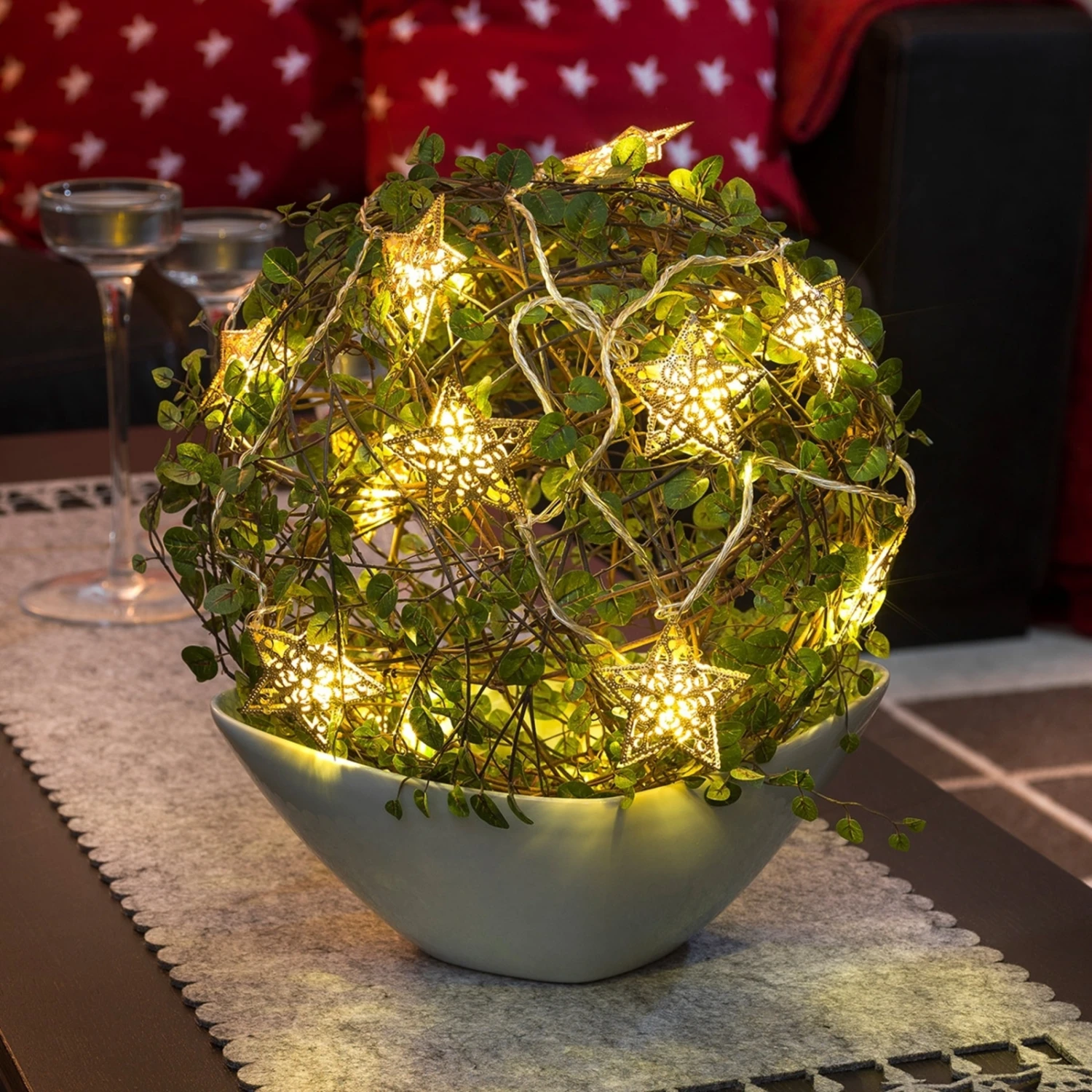 Die Weihnachtszeit dekorativ verschönern – dazu eignet sich diese schöne Lichterkette mit goldfarbenen Metallsternen geradezu ideal. Ob im Fenster, auf dem Tisch oder dem Regal – zahlreiche Möglichkeiten ermöglichen eine individuelle, gemütliche Winter- und Weihnachtsdekoration. Mit Innentrafo ausgestattet.