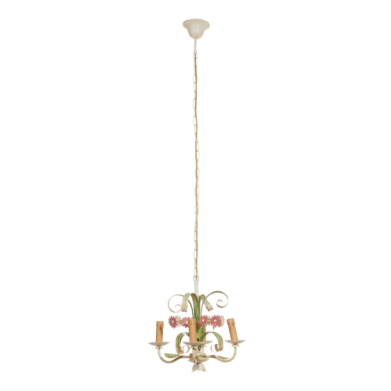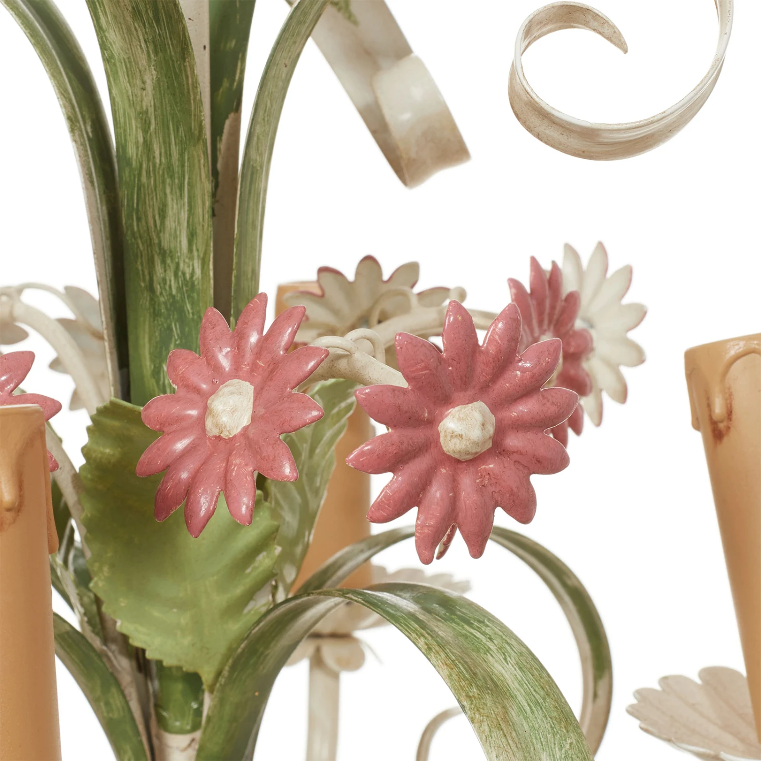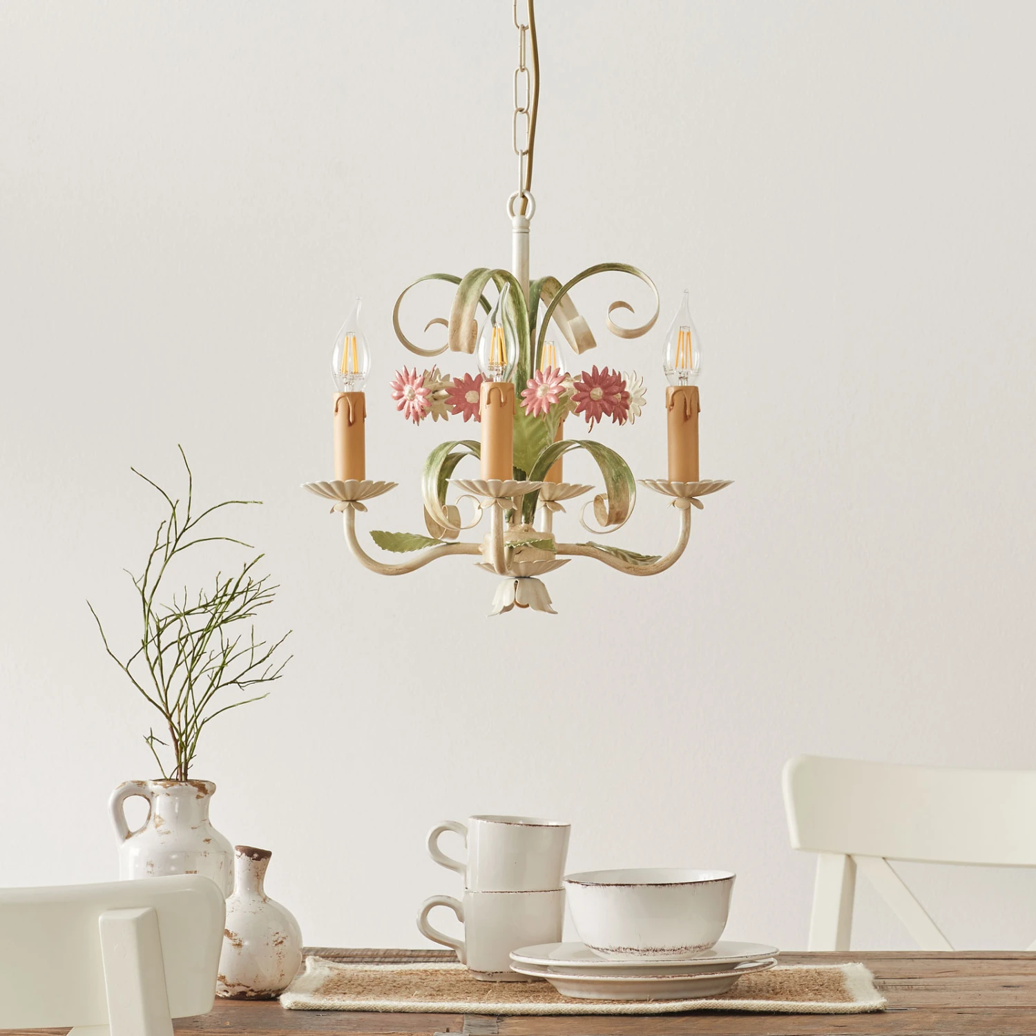 Eine relativ kompakte Ausgabe eines Kronleuchters ist das vierflammige Modell Toscana. Aber auch mit nur vier Lichtquellen und einer kleinen Krone stellt dieser Kronleuchter einen typischen Vertreter seiner Art dar. Die vier Kerzen sind rund um die Krone, die mit roten Blüten und grünen Blättern aus Eisen verziert ist, auf kleinen Tellern positioniert.