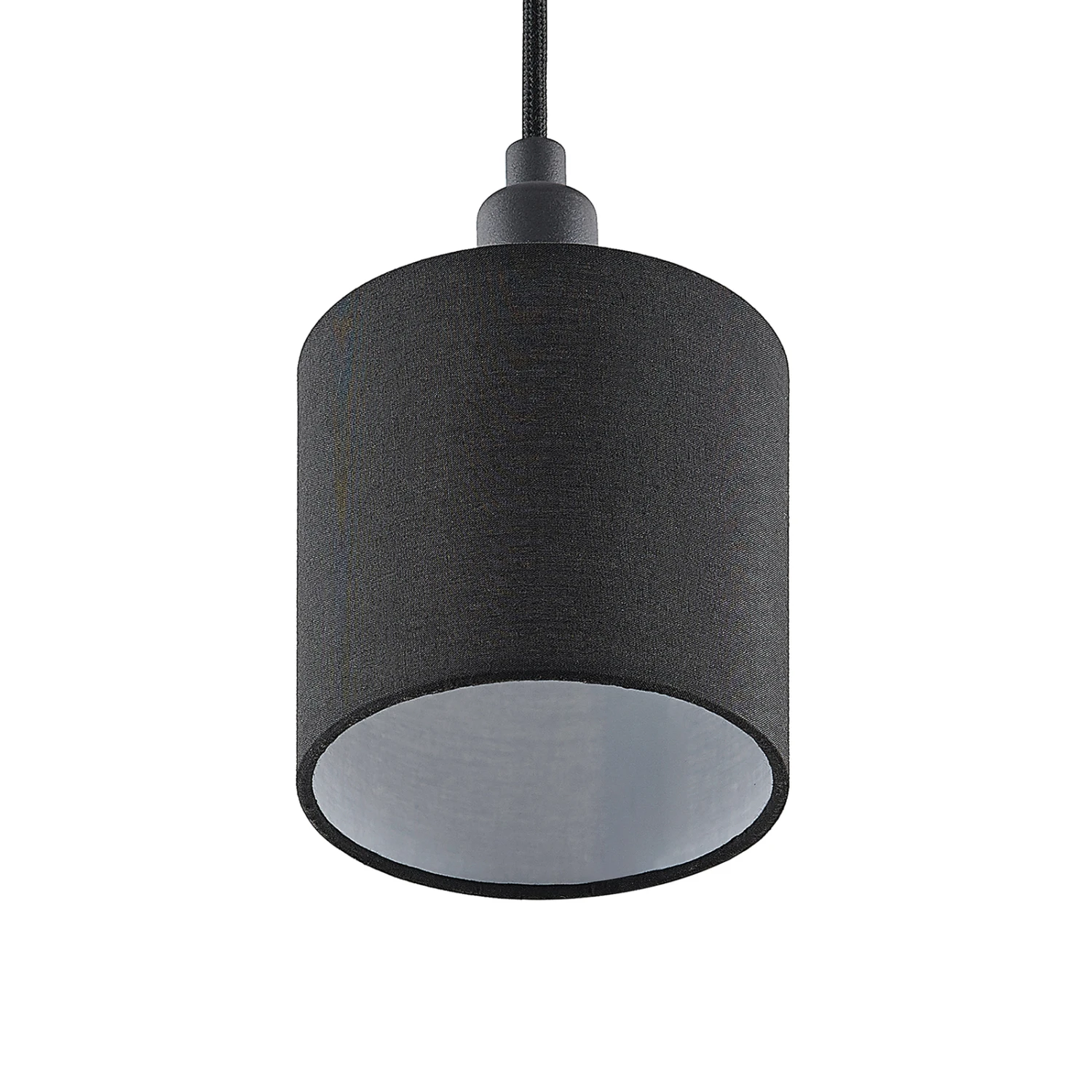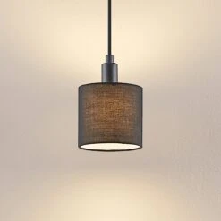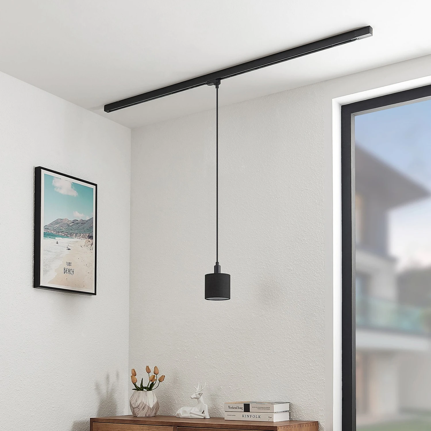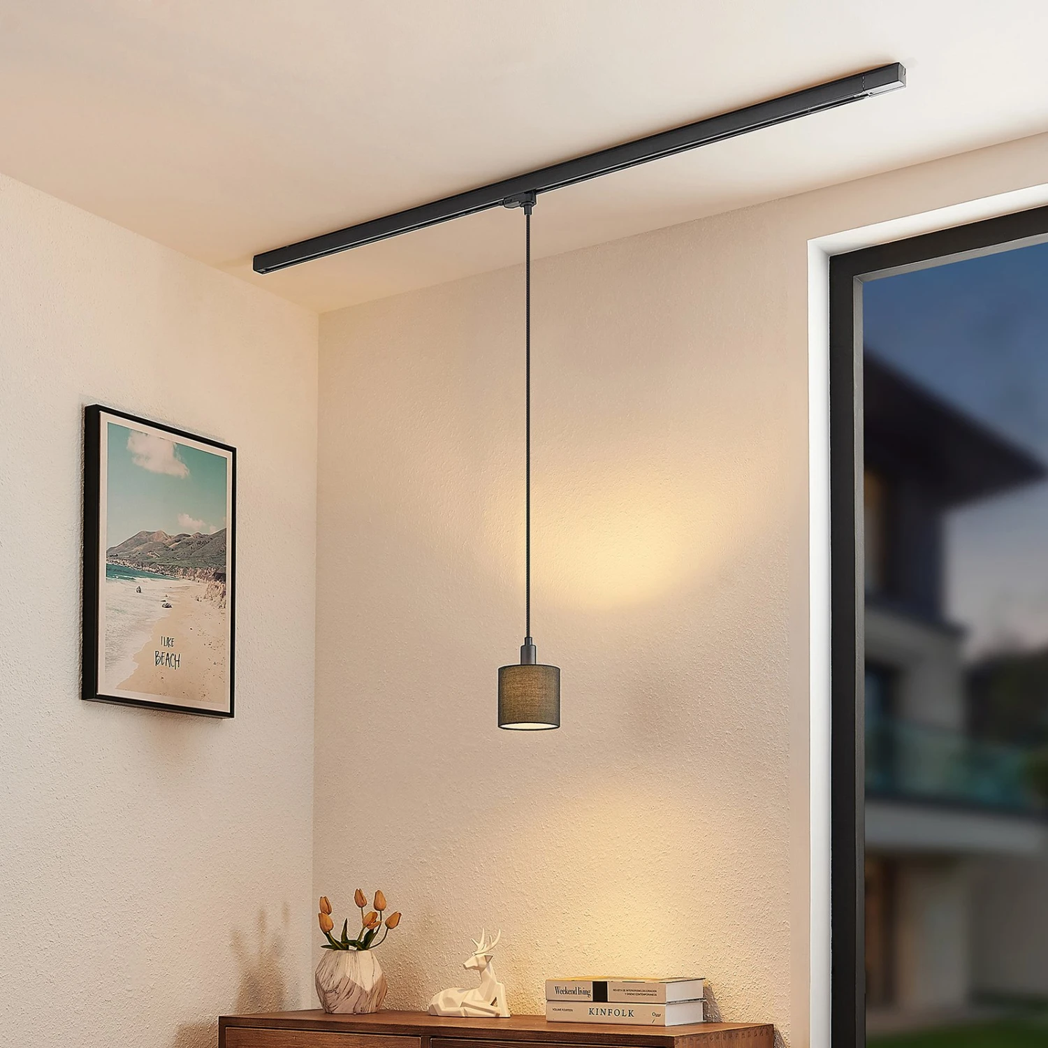 Pendelleuchte Heleni mit sandschwarzem Textilschirm in zylindrischer Form, in ein 3-Phasen-Schienensystem integrierbar