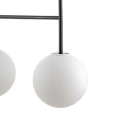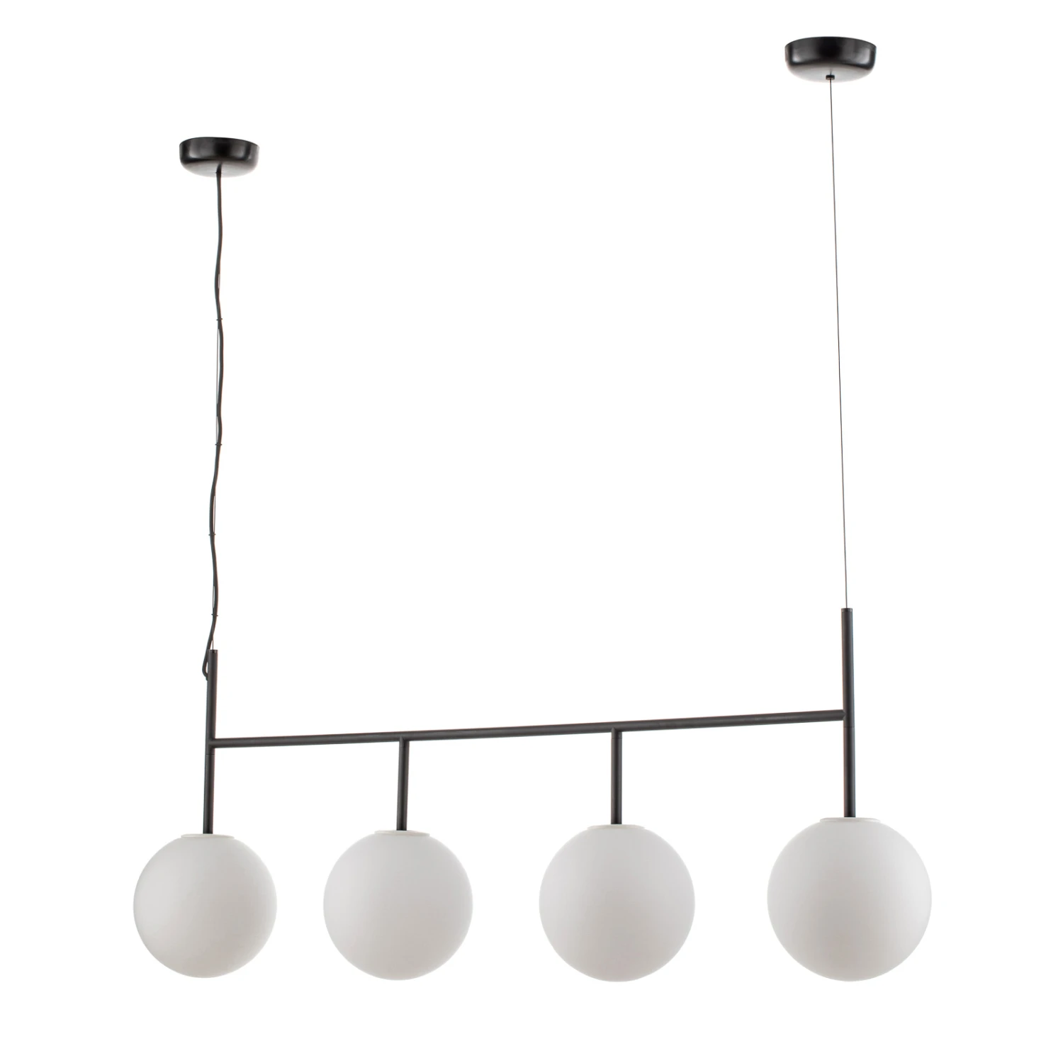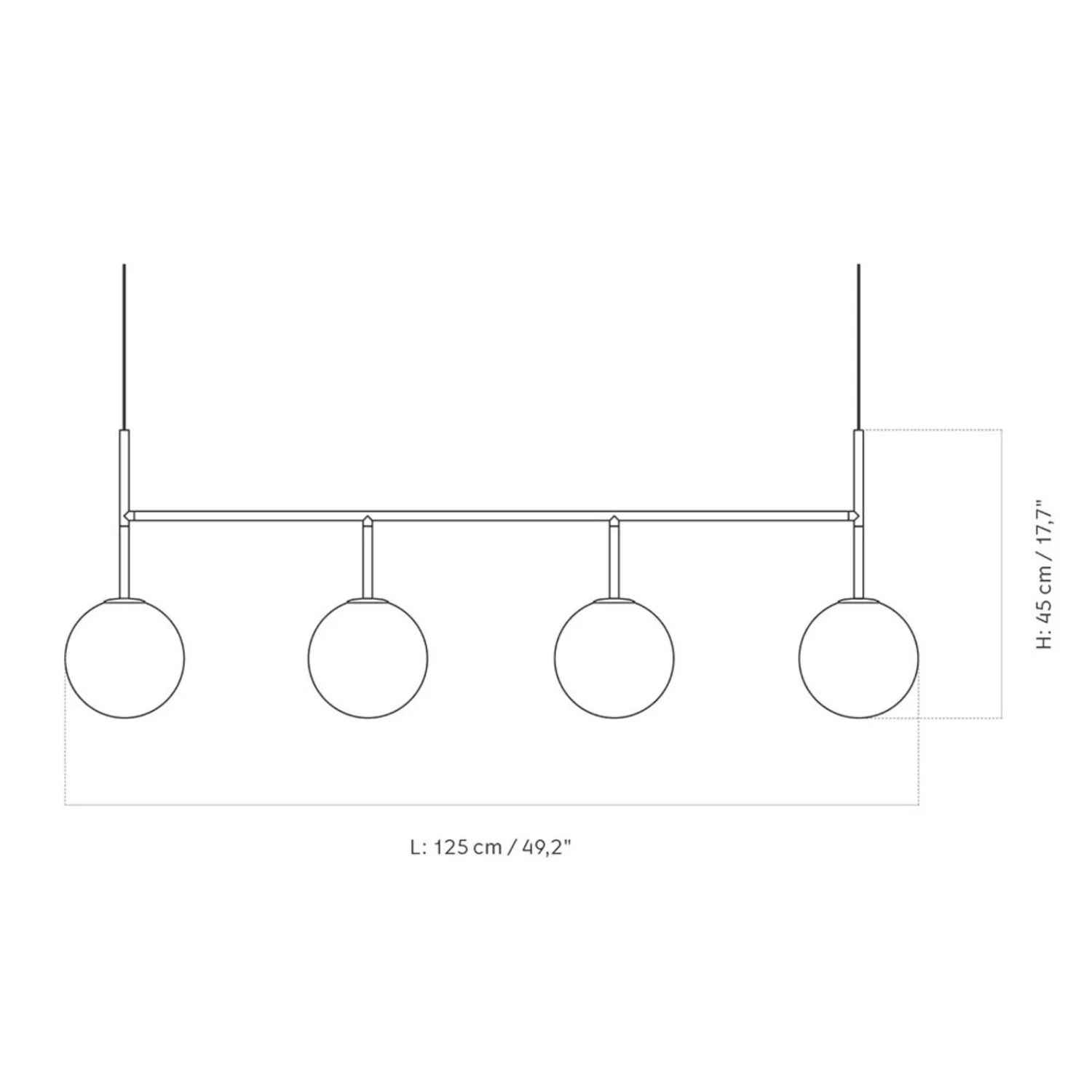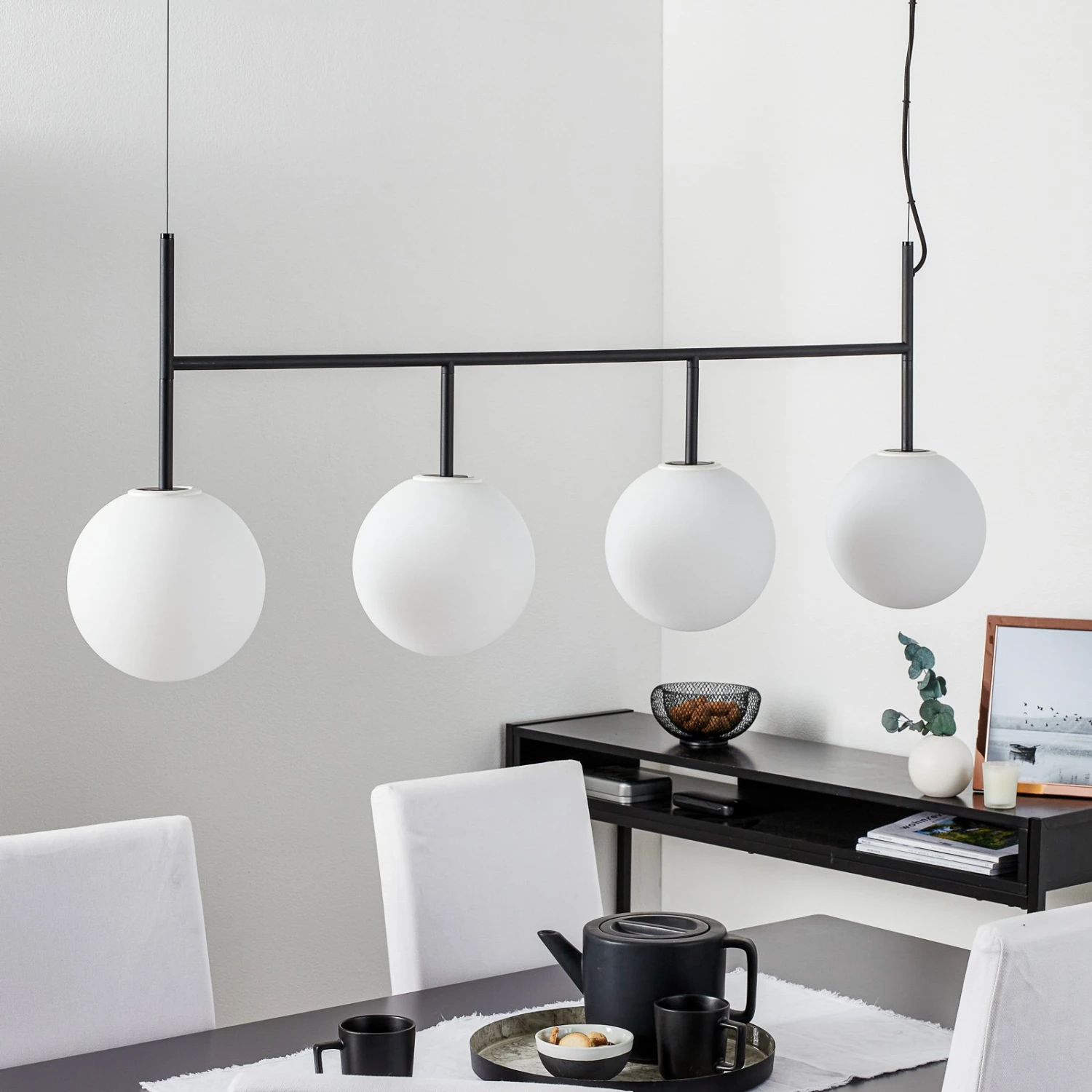 Die LED-Hängeleuchte TR Bulb Suspension Frame punktet mit ihrem minimalistischen Look und der klassischen Farbgebung. Der Metallrahmen mit schwarzem Finish ist in die Länge gezogen. Daran sind in einer Reihe vier Lichtquellen aus wertigem Opalglas angebracht.