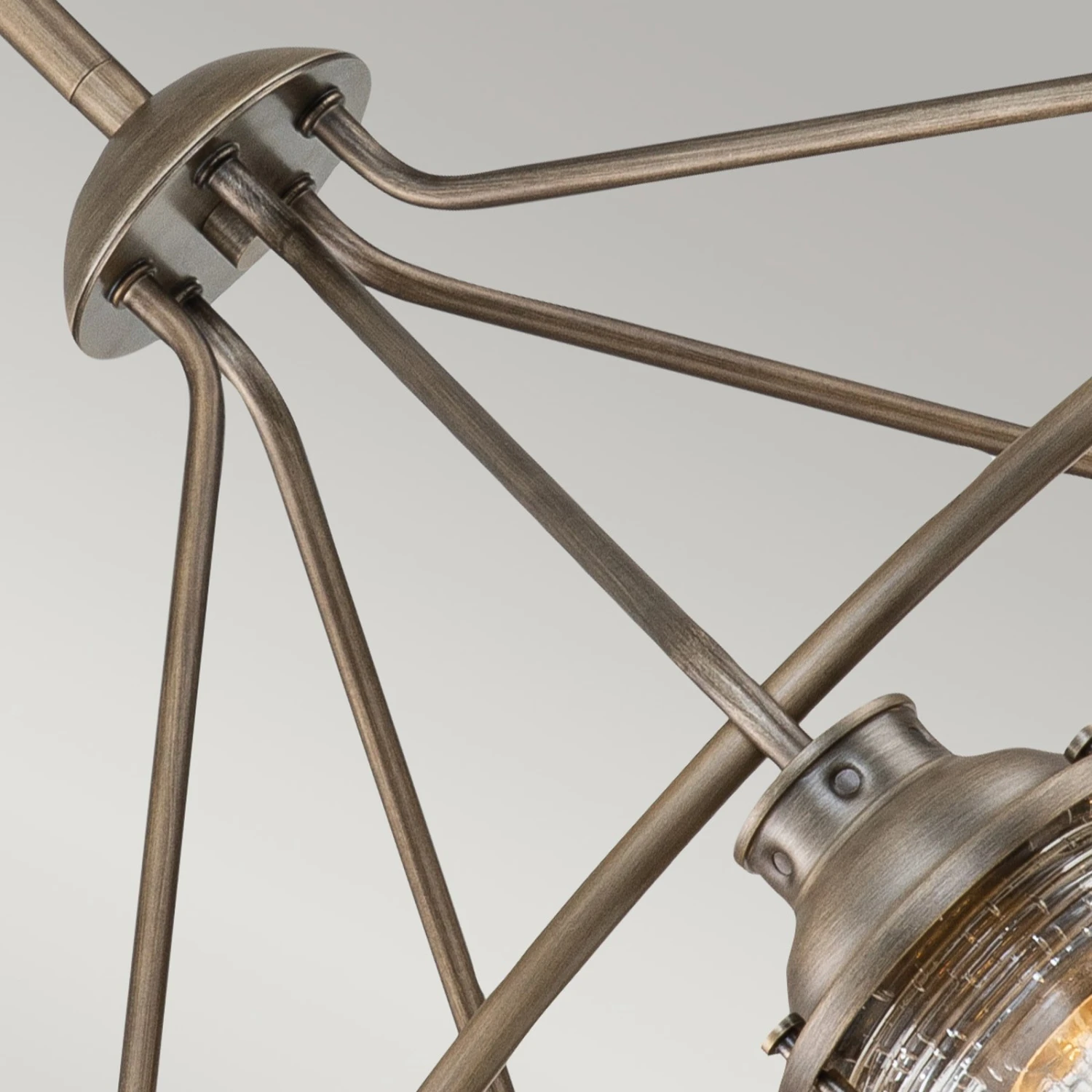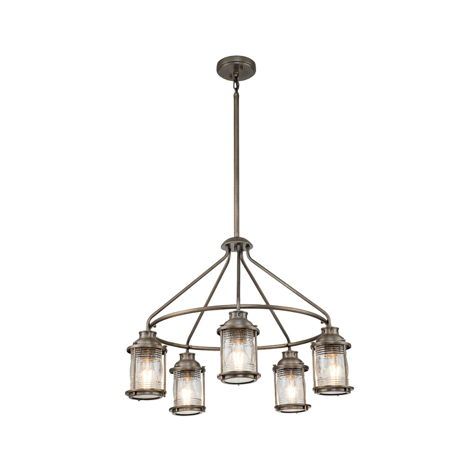 Dieser ästhetisch gestaltete Kronleuchter ist dank Schutzart IP44 für die Nutzung im Außenbereich konzipiert. Das Gestell ist schlicht ringförmig und in gebürsteter Bronze lackiert. Fünf Streben erstrecken sich über das Gestell, an denen jeweils ein laternenförmiger Schirm hängt. Das klare Glas ist mit einer dekorativen Samenkornstruktur ausgestattet, die dem abstrahlende Licht eine besondere Wirkung verleiht. Ideal für die festliche und stimmungsvolle Beleuchtung von überdachten Terrassen und Balkonen geeignet, Filament-Leuchtmittel sorgen für den letzten Schliff. Die Leuchtmittel sind nicht im Lieferumfang enthalten – über Zubehör bestellbar.