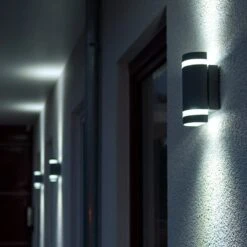 Wundervolle Außenwandleuchte mit zwei Lichtquellen, die jede Wand auf besondere Art dekoriert und spezielle Effekte entstehen lässt. Auf diese Weise setzt Focus ganz besondere Akzente auf Balkon oder Terrasse.