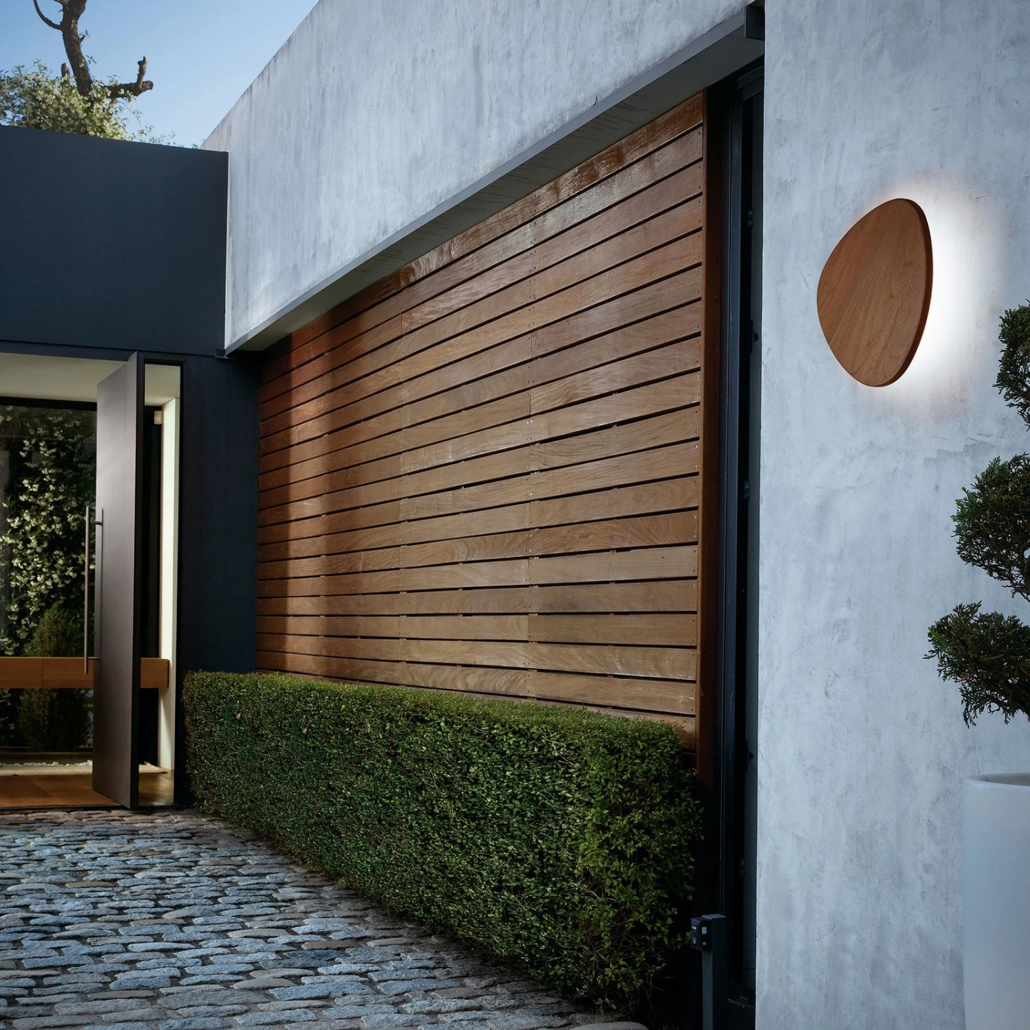 Das Design der Außenwandleuchte Tria vom spanischen Hersteller Bover ist sehr schlicht und schnörkellos, dennoch erzielt die Leuchte sehenswerte Effekte an der Hausfassade. Die Leuchte verfügt über fest verbaute LEDs, deren Licht auf eine Platte projiziert wird. Dadurch entsteht um die Leuchte herum ein Kranz aus indirektem, warmen Licht. Die Platte besteht aus Teakholz und verleiht dem minimalistischen Design einen Hauch Wärme. Tria kann um 350° gedreht werden, sodass das entstehende Spiel aus Licht und Schatten immer wieder verändert werden kann. Die Leuchte setzt als einzelner Lichtakzent zum Beispiel Eingangsbereiche in Szene oder wird in einer Gruppeninstallation zu einem modernen Wandgemälde.