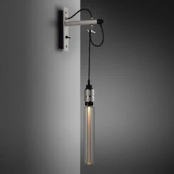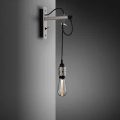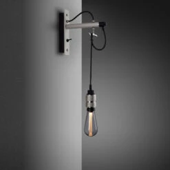 Dieser Lichtspender ist offen und reduziert gestaltet und wartet zugleich mit technischer Raffinesse auf. Hooked Wall nude besteht aus einer rechteckigen Wandhalterung mit sichtbaren Schrauben und einem Schalter, einem Ausleger, einem 45 cm langen Kabel und einer daran hängenden Fassung. Die festen Bauteile sind auch aus massivem Metall gefertigt. Besondere Merkmale sind zum einen die Aufhängung der Lampenfassung an einem Haken, der unten am Ausleger befestigt ist, und zum anderen die technisch wirkende Optik mit einer Fassung, die durch das Kreuzrändelmuster im Diamantschliff an eine Schraubverbindung erinnert. Die Abhängung lässt sich ganz nach Belieben variieren. Mit einem dekorativen Leuchtmittel ausgestattet, entfaltet die Leuchte ihre volle Wirkung. Eine passende Lampe, die vom Hersteller speziell entworfen wurde, kann über das Zubehör mitbestellt werden.