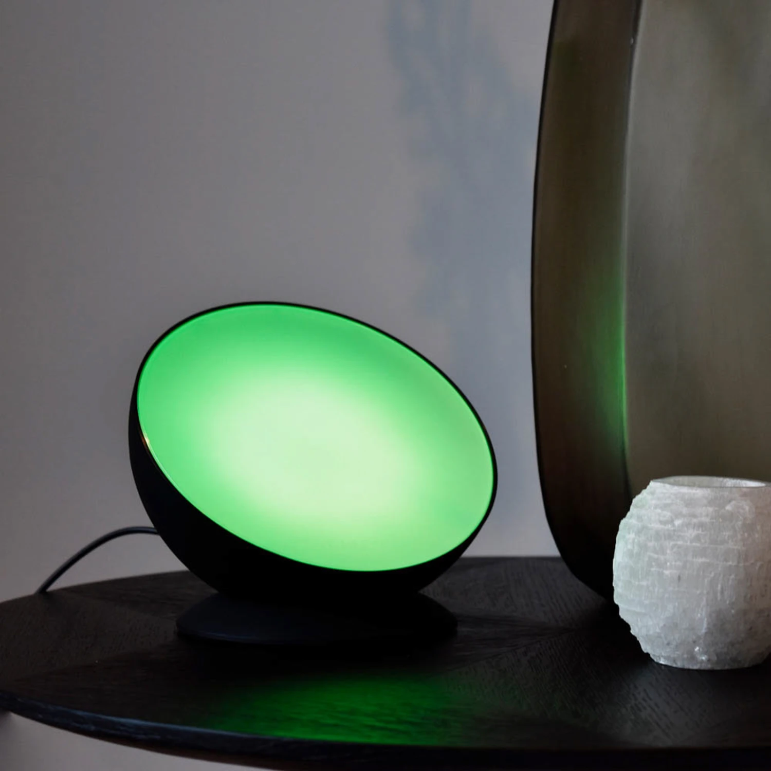 Die moderne LED-Tischleuchte Smart Moodlight besteht aus Kunststoff und setzt sich aus einer schräg aufgestellten Halbkugel und einem gewölbten Fuß zusammen. Ein opalweißer Diffusor sorgt für eine blendungsarme Lichtabgabe. Wahlweise kann weißes Licht (3.000 K – 6.500 K) oder buntes RGB-Licht eingestellt werden. Zusätzlich ist Smart Moodlight stufenlos dimmbar.