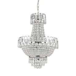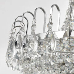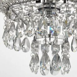 Wer die Kristall-Pendelleuchte Casparia entdeckt, der wird mit einem großen und begeisternden Staunen auf ihr Erscheinungsbild reagieren, denn sie ist wirklich von oben bis unten mit hochwertigen Kristallanhängern bestückt. Unten, oben und an den gebogenen Elementen in der Mitte sind es tropfenförmige Kristalle, die Casparia schmücken, während im Teil dazwischen formschöne Ketten aus klarem, rund geschliffenem Kristall angebracht worden sind. In eingeschaltetem Zustand bewirkt die Pendelleuchte ein glamouröses Funkeln und zieht alle, die den Raum betreten, in ihren Bann. Optisch vereint sie die klassische Schönheit einer Kristall-Pendelleuchte mit einer modernen Ausstrahlung, denn das Gestell der detailreichen Leuchte besteht ausschließlich aus glänzendem Metall mit hübscher Chromoberfläche. Da kommt festliches Flair auf!