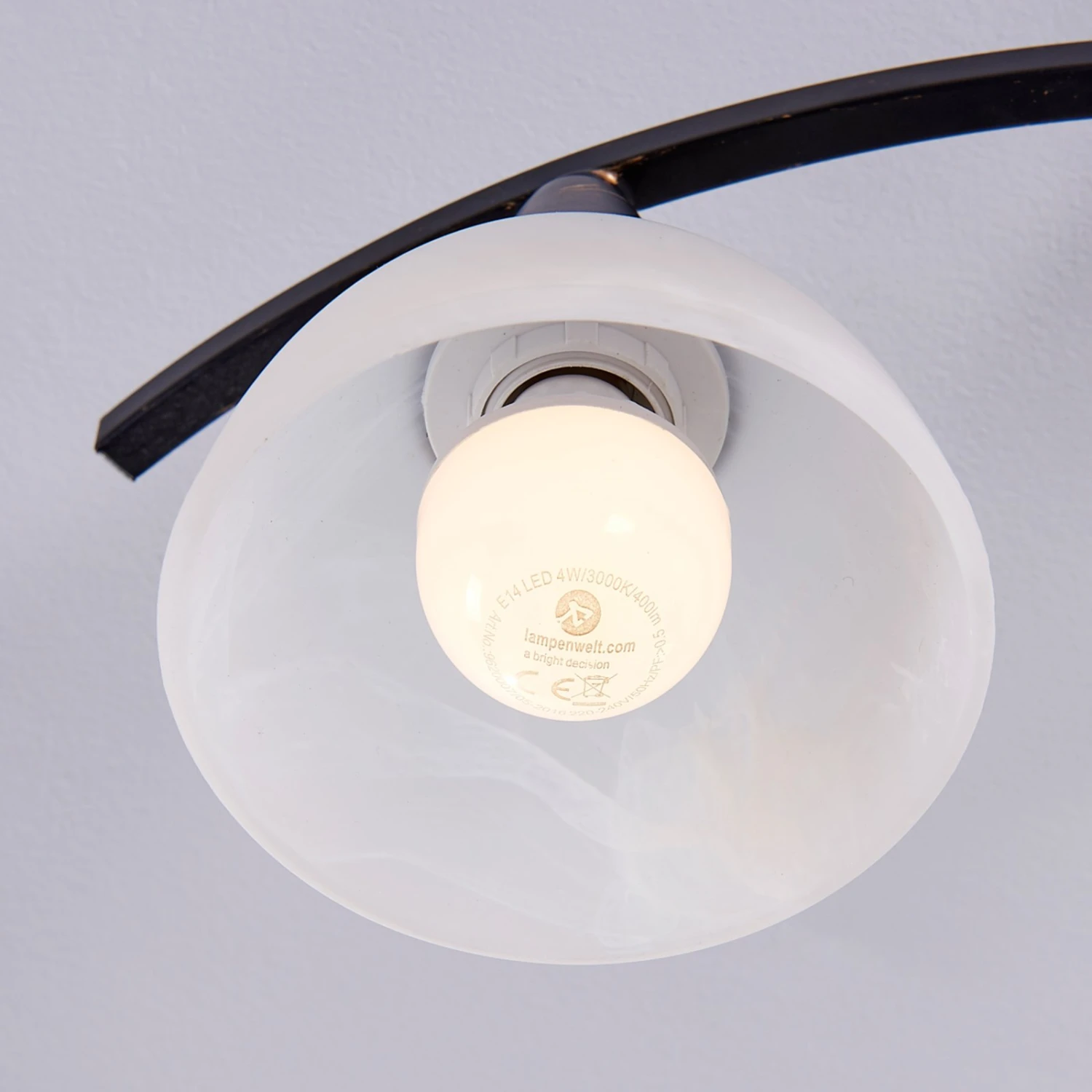 Della besteht zu einen aus den weißen Schirmen mit Alabastertönung, zum anderen aus einem interessant geformten Gestell, das sich aus drei bogenförmigen Armen zusammensetzt. Diese Leuchtenarme sind wie auch die Deckenhalterung schwarz lackiert und haben ein goldfarbenes Bürstenfinish, was nicht nur elegant aussieht, sondern die Deckenlampe auch etwas rustikaler erscheinen lässt.