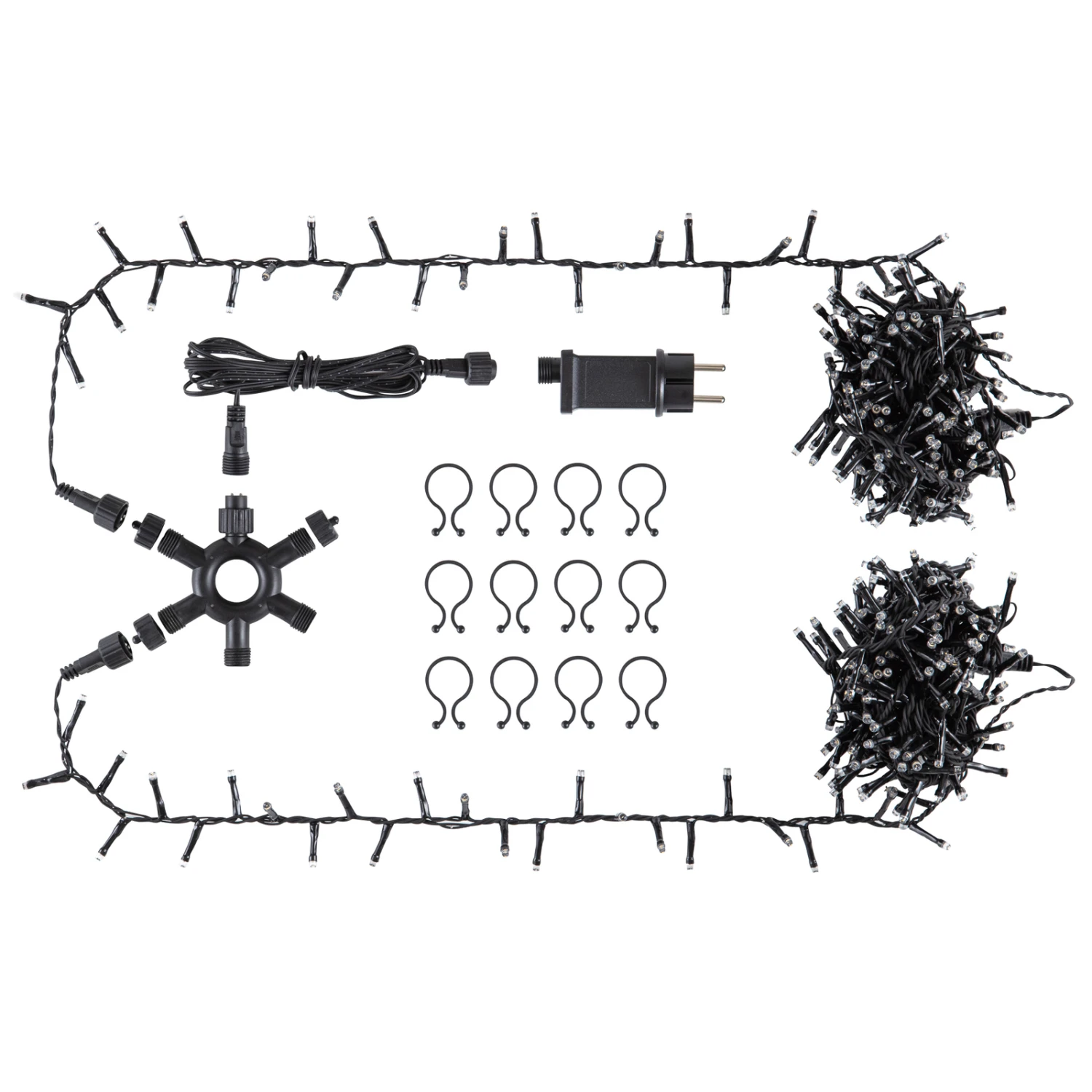 Lieferumfang: 2 x 5 m Lichterkette, 5 m Zuleitung, 1 Verteilerring mit 5 Ausgängen, 31V-Trafo (IP44) mit Dimmer und Timer, 12 Klammern