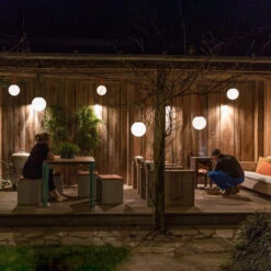 Der runde Diffusor mit opaler Außenfläche zaubert ein sanftes und gleichmäßiges Licht in alle Richtungen. Dank der Schutzkart IP55 ist sie vor Staub und Strahlwasser bestens geschützt, was sie zur idealen Lichtquelle für den Außenbereich macht – gleichwohl kann sie aber auch in Innenräumen für ein stimmungsvolle Beleuchtung sorgen. Die Außenseite wurde komplett aus Kunststoff hergestellt, während die Innenseite mit einer Aluminium-Sockelplatte und einem LED-Gehäuse versehen wurde. Die farbige Schlaufe besteht aus Silikonkautschuk. Die durchdachte und einfache Formgebung der LED-Kugelleuchte stammt von der Designerin Nathalie Schellekens, die im Jahr 2006 das Designstudio Studio ONS gründete.