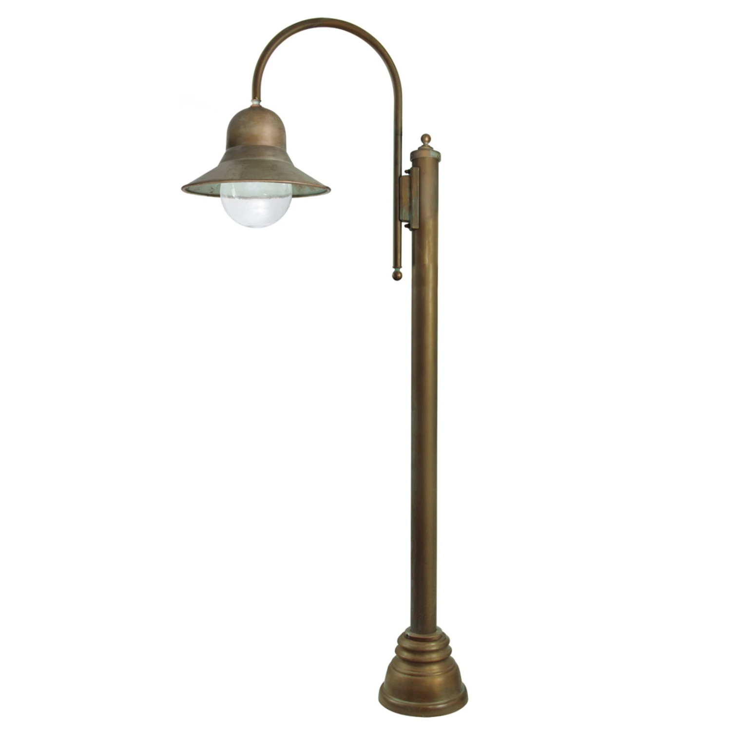 Die mit einer Höhe von 155 cm vergleichsweise große Wegeleuchte Felizia aus antikisiertem Messing bringt mediterranen Charme und helles Licht in den Garten oder die unterschiedlichsten Außenanlagen gewerblicher Objekte. Hochwertige Materialien und beste Verarbeitung machen die Leuchte zu einem Qualitätsprodukt, das seewasserfest ist und auch in Meeresnähe eingesetzt werden kann. Durch den transparenten Glasschirm beleuchtet die Wegeleuchte einen recht weiten Bereich ringsum mit hellem Licht.
