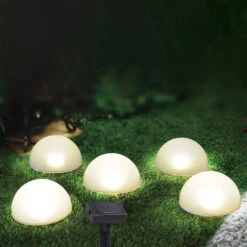 Die fünf LED-Solarleuchten sind miteinander verbunden und in einem Abstand von 50 cm angebracht. Jede halbkugelförmige Leuchte verfügt über einen Erdspieß, mit dem sie problemlos im Gartenboden befestigt werden kann. So wirkt es, als würden die Solarleuchten direkt auf dem Gras aufliegen. Gartenwege oder Beetbegrenzungen können mit dieser Kette atmosphärisch beleuchtet werden. Die Leuchte lässt sich mit einem integrierten Schalter bequem ein- und ausschalten. Durch Solarmodul und Akkubatterie funktioniert die Solarlampe ohne externe Stromzufuhr und kann ganz flexibel platziert werden. Die Leuchtdauer beträgt sechs bis acht Stunden.
