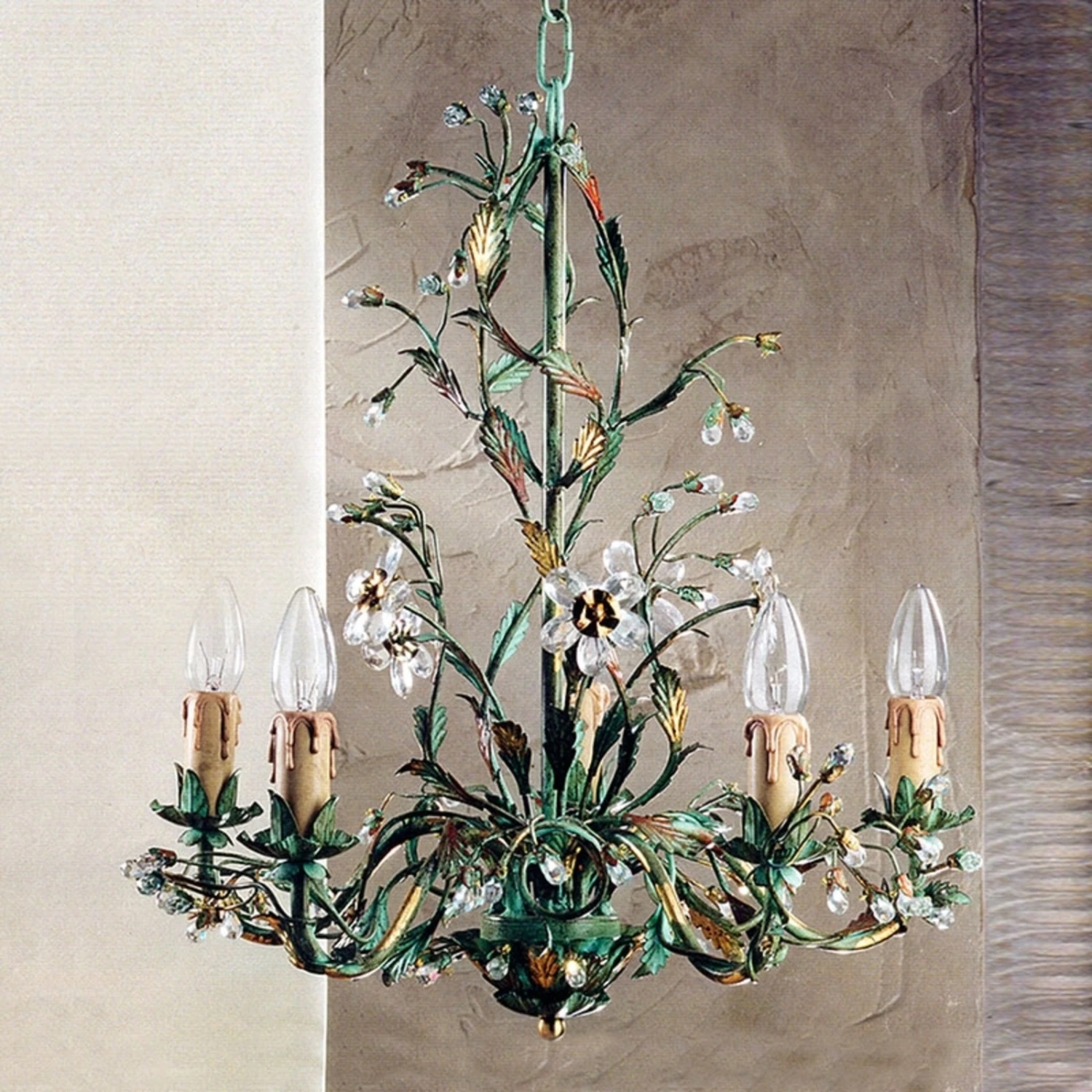 Sattes, dunkles Grün ist eines der hervorstechendsten Merkmale dieses kunstvoll gestalteten Lüsters aus Metall und Kristall. Er stellt eine perfekte Nachahmung der Natur mit ihrer frischen und lebendigen Kraft dar und bringt ein Stück dieser besonderen Ausstrahlung in den Wohnraum. Wie Blätterrispen wirkt das grüne Gestell aus Metall, das zum Teil mit goldener Patina belegt ist, und kunstvoll gearbeitete Kristallblüten ergänzen das Erscheinungsbild auf harmonische Weise.