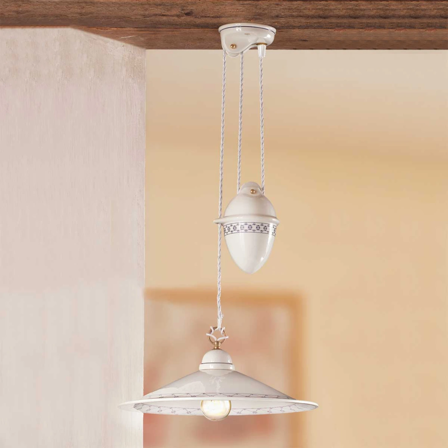 Der Lampenschirm ist aus weißer Keramik, der äußere Rand mit einem hochwertigen blauen Dekoband versehen. Das Zugpendel ist in gleicher Weise gestaltet und macht die Lampe zu einem außergewöhnlichen Blickfang.