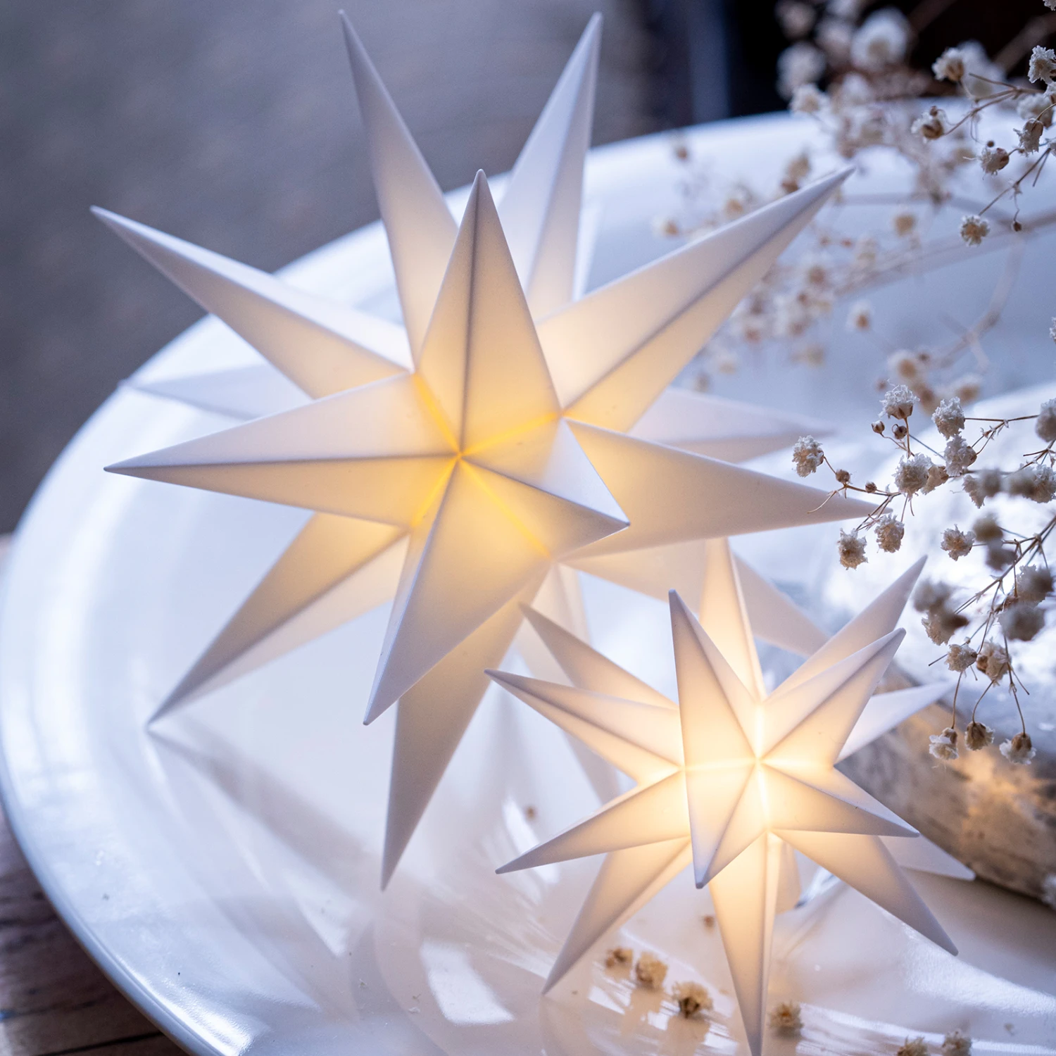 Der dekorative Stern wird von LEDs beleuchtet, deren Licht die ungewöhnliche Form mit den vielen Zacken besonders hübsch zur Geltung bringt. Es können drei AA-Batterien in das mitgelieferte Batteriefach eingesetzt werden. Passende Batterien sind separat über das Zubehör erhältlich.
