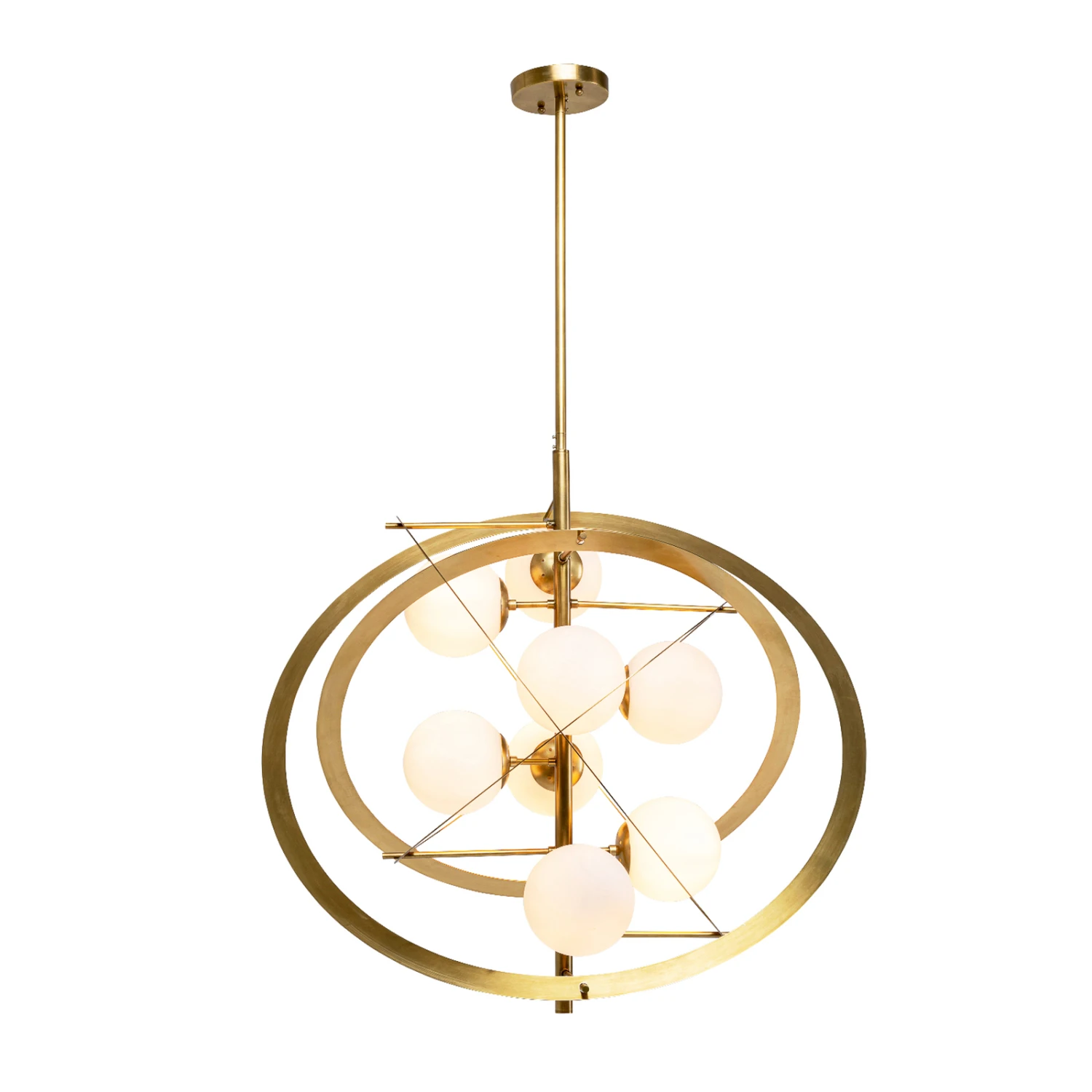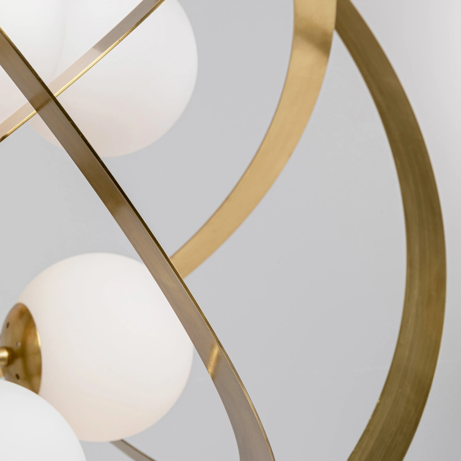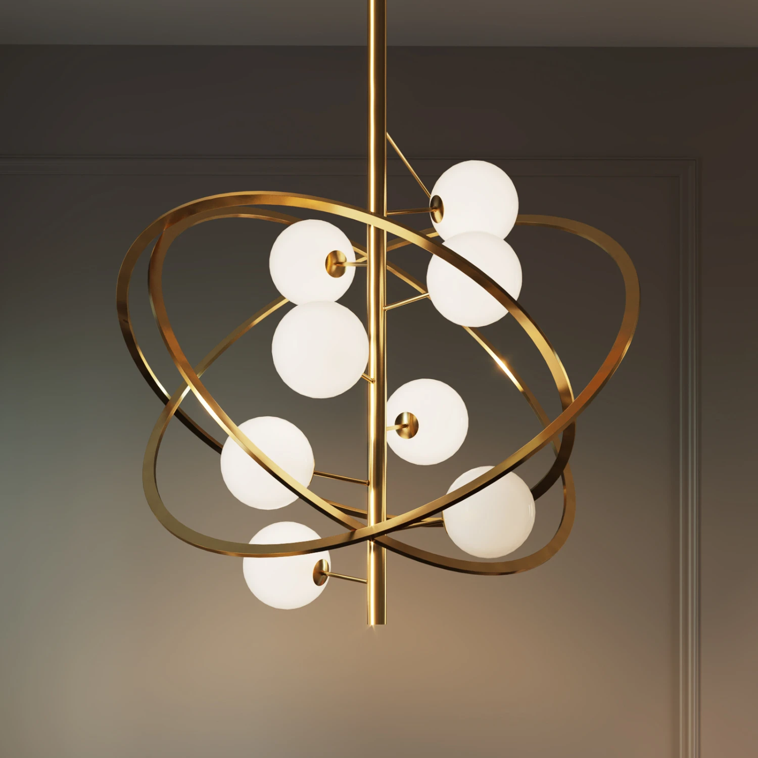 In schöner Gestaltung präsentiert sich die Hängeleuchte Galaxia, die zum Blickfang in jedem Raum wird, ob über dem Esstisch oder der Sitzgruppe im Wohnzimmer. Acht opalweiße Glaskugeln umkreisen wie kleine Planeten den Mittelpunkt der Leuchte. Die messingfarben beschichteten Ringe aus Metall umgeben die Glaskugeln wie Umlaufbahnen.