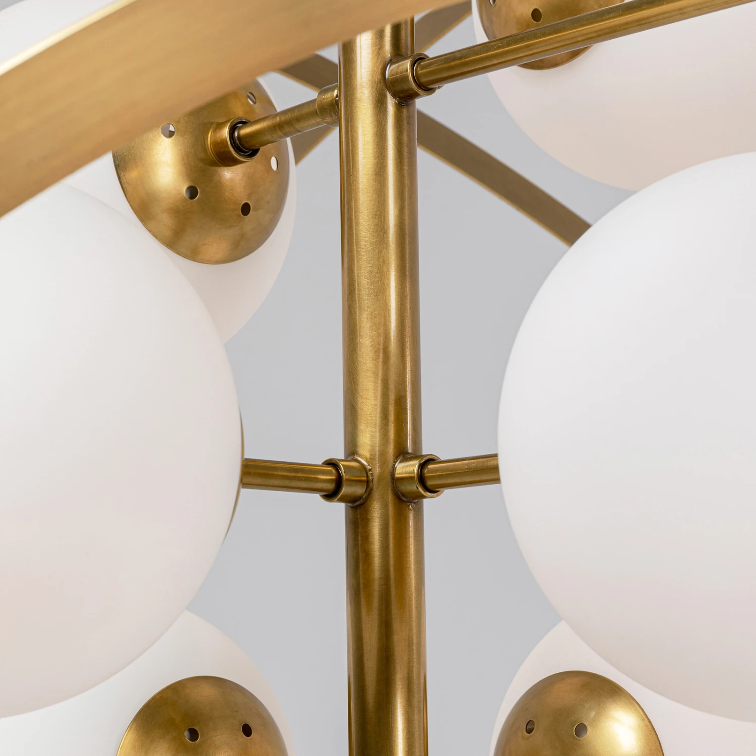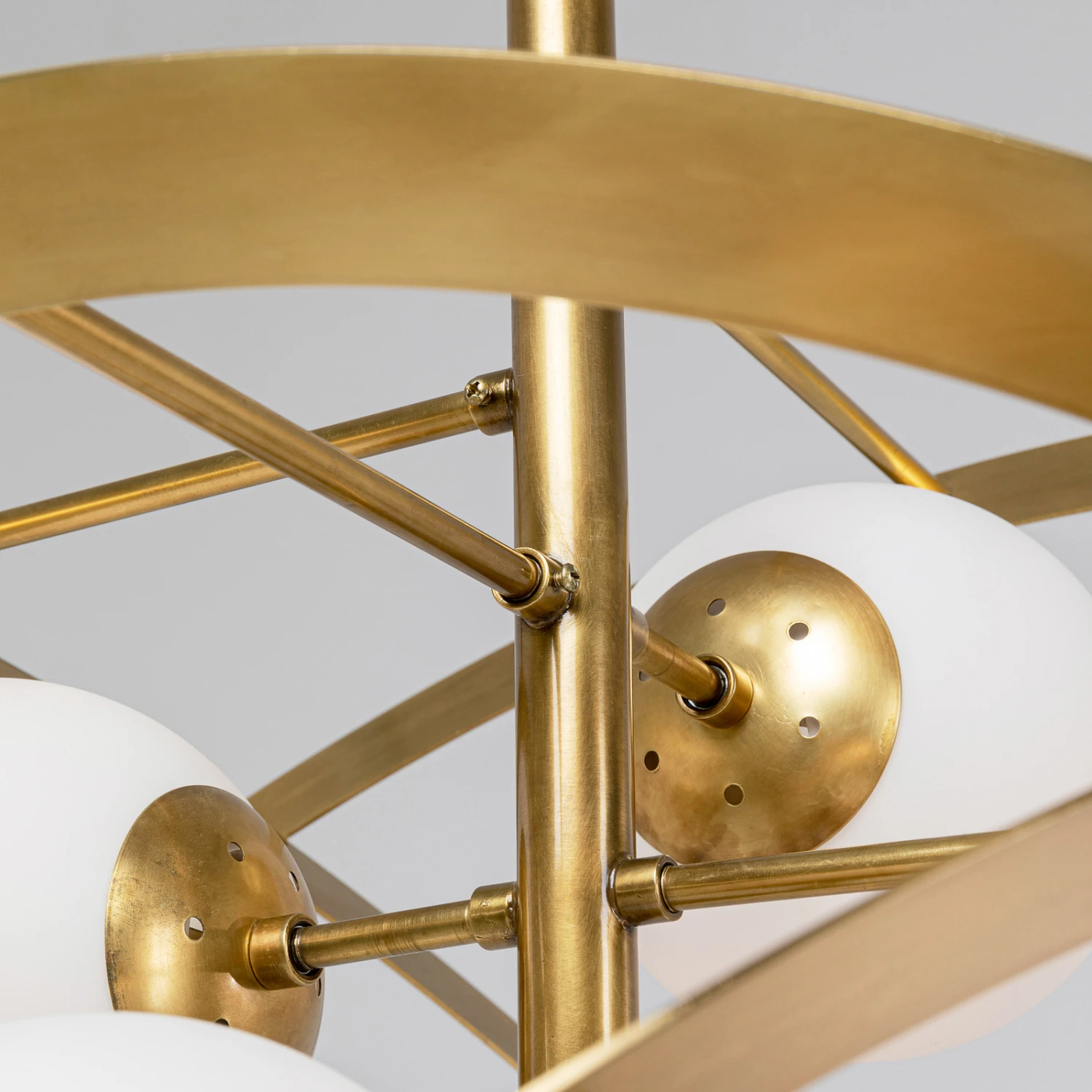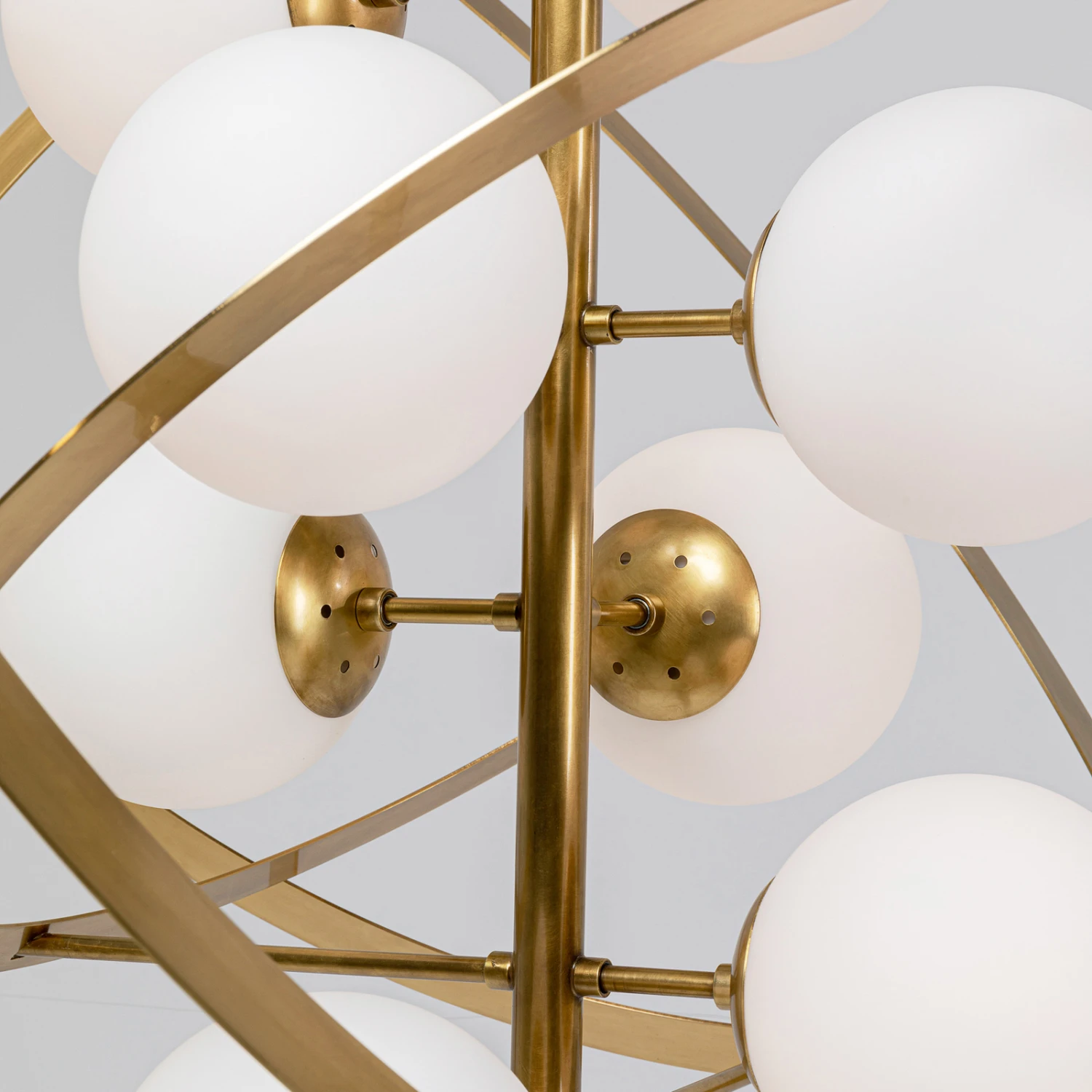 In schöner Gestaltung präsentiert sich die Hängeleuchte Galaxia, die zum Blickfang in jedem Raum wird, ob über dem Esstisch oder der Sitzgruppe im Wohnzimmer. Acht opalweiße Glaskugeln umkreisen wie kleine Planeten den Mittelpunkt der Leuchte. Die messingfarben beschichteten Ringe aus Metall umgeben die Glaskugeln wie Umlaufbahnen.