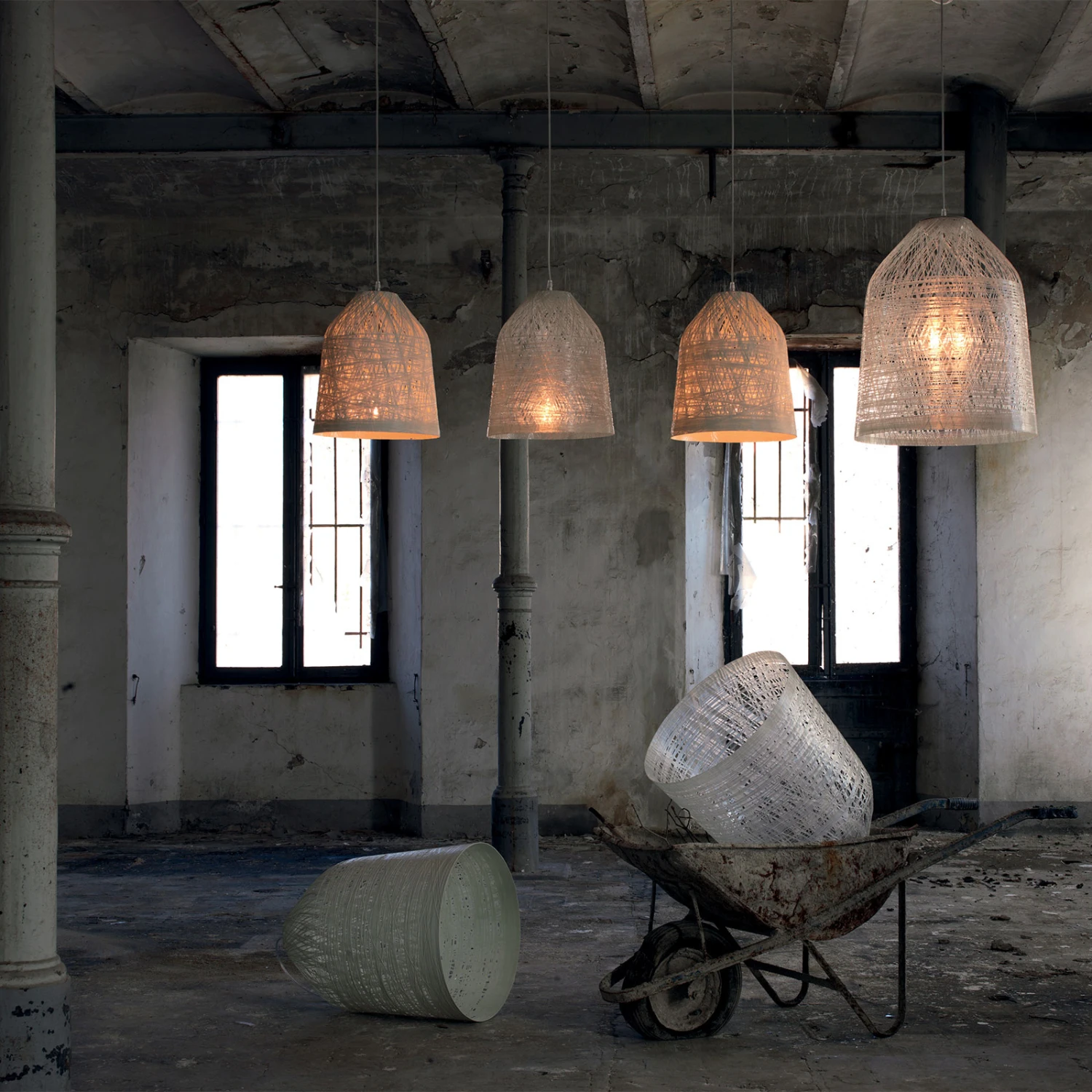 Besonders gut kommt die LED-Pendelleuchte Black Out in einer ansonsten dunklen Umgebung zur Geltung, wie sie beim namensgebenden Stromausfall vorzufinden ist. Ihr Schirm besteht aus einem Geflecht aus Fiberglas-Fäden, die bei der Herstellung um eine sich drehende Form gesponnen werden, bis nur noch kleine Zwischenräume verbleiben. Beispielsweise über einem Terrassentisch bietet der nach unten offene Schirm direkte Beleuchtung. Die Abpendelhöhe lässt sich den Gegebenheiten entsprechend anpassen, indem das 5 m lange Kabel beispielsweise über den Deckenbalken gewickelt wird.