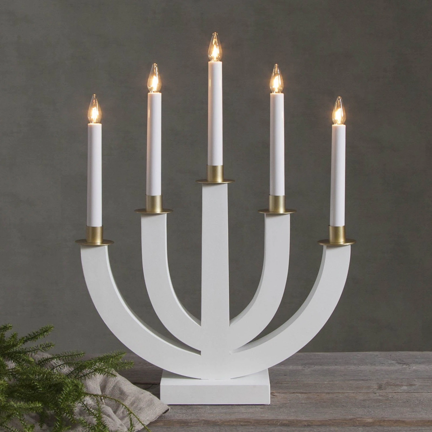 Exklusives Design mit schwungvoller Form zeichnet den Kerzenleuchter Eli aus. Eli besteht aus weiß lackiertem Holz, die Kerzenteller sind aus Metall mit goldfarbenem Finish. Eli eignet sich ausgezeichnet für die stilvolle Weihnachtsdekoration und wirkt vor einem Fenster platziert ebenso auffällig wie z. B. als stimmungsvolle Akzentbeleuchtung auf dem Kaffeetisch. Die Leuchtmittel sind bereits in der Lieferung enthalten. Auch Ersatzlämpchen werden mitgeliefert. Mit Schalter am Kabel ausgestattet.