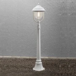 Klassische, aus Aluminium gefertigte Wegeleuchte Parma. Das klare Leuchtenglas garantiert eine optimale Ausleuchtung. Der schön geformte Schirm und die Verzierungen an Leuchte und Mast verleihen der Leuchte eine leicht nostalgische Wirkung.