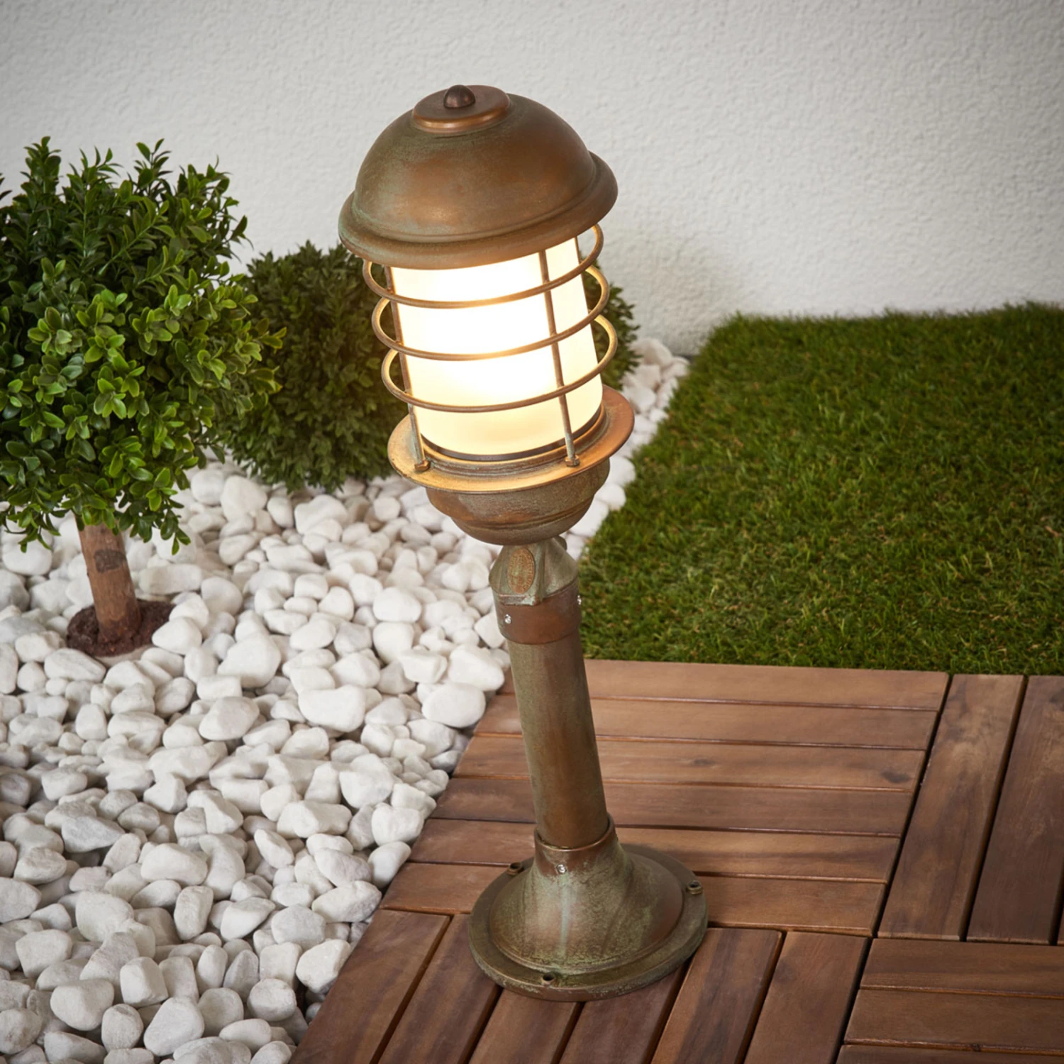 Die robuste Sockelleuchte Carlon ist eine ideale Beleuchtung für Grundstücke. Die Leuchte ist nicht nur korrosionsbeständig, sondern verfügt auch noch über einen Seewasserschutz. Das attraktive Erscheinungsbild aus antik gehaltenem Messing versprüht ländlichen Charme und kommt auf unterschiedlichsten Grundstücken gut zur Geltung. Der helle Glasschirm wird mit einem Gitter geschützt und erstrahlt in hellem Licht.