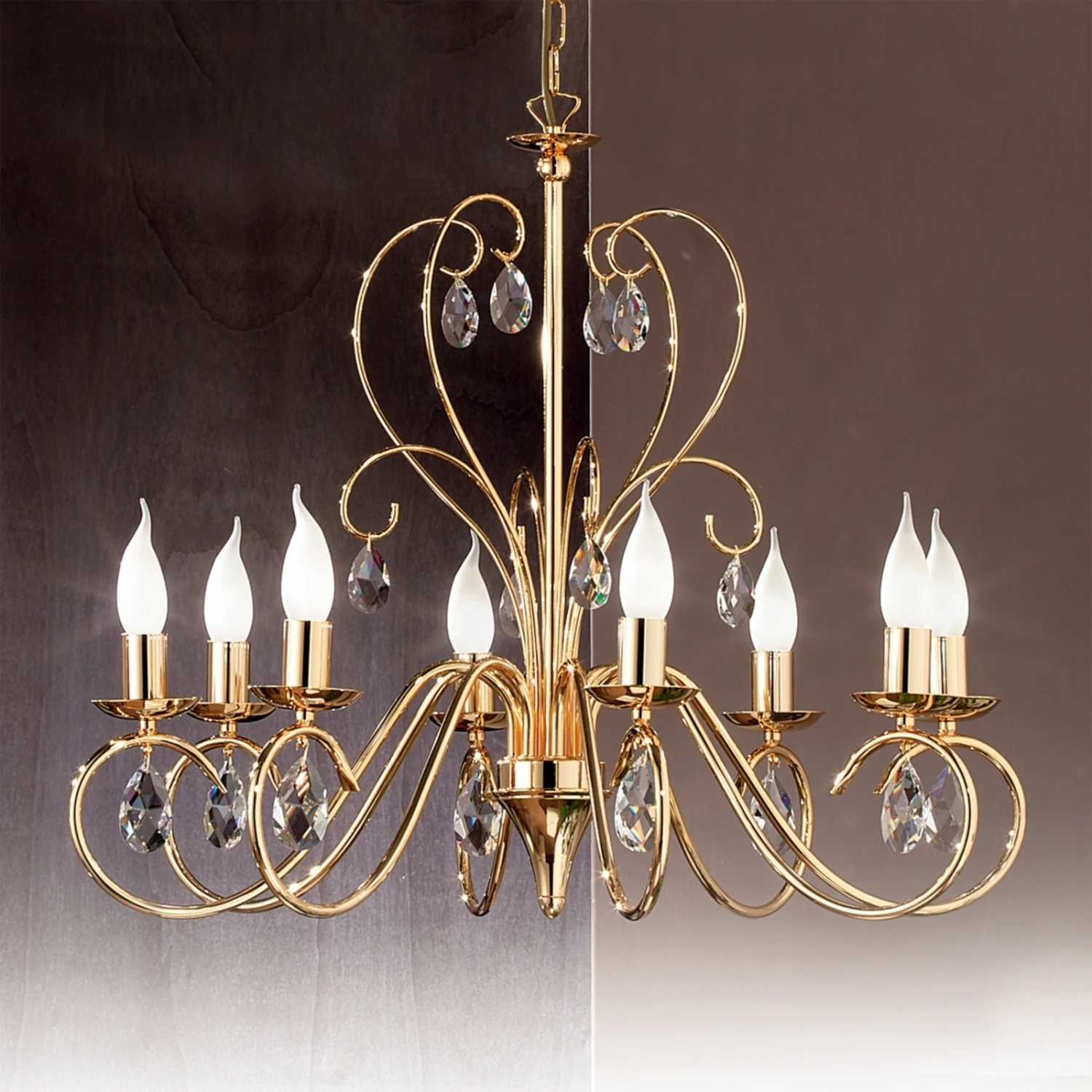 Der Kronleuchter Alessia ist äußerst grazil geformt, mit phasenweise angesetzten Bleikristallen und einer vergoldeten Eisenoberfläche. Die acht kerzenförmigen Leuchtmittel sorgen für ein helles, leicht funkelndes Licht im ganzen Raum.