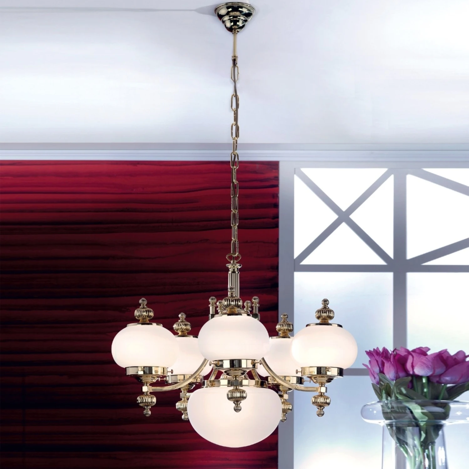 Sechsflammiger Kronleuchter Delia mit Opalgläsern und Messinggestell