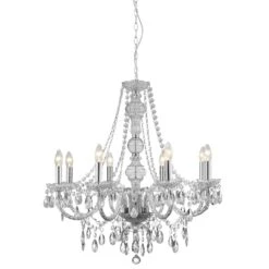 Prächtig und herrschaftlich zeigt sich der achtflammige Kronleuchter Marie Therese in seiner Kombination aus verchromtem Metall und klarem Glas. Die Abhängung des Kronleuchters wurde mit zahlreichen Glaselementen geschmückt und auch die Leuchtenarme sind mit klarem Glas ummantelt, mit klaren Kerzentellern ausgestattet und mit zahlreichen Ketten mit runden, flachen Elementen und Tropfen aus geschliffenem Kristallglas geschmückt.