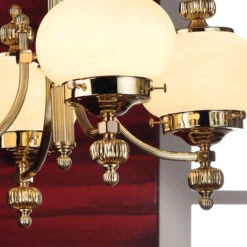 Exklusive Dreichschichtgläser im Farbton Creme-matt umschließen die Lichtquellen des klassisch anmutenden Kronleuchters Ophelia. Gehalten werden sie von sanft geschwungenen Leuchterarmen, die – wie das komplette Gestell – aus Vollmessing sind, das glanzpoliert wurde. Besonders detailreiche Zierteile aus Messingdruckguss befinden sich sowohl an den Gläsern selbst als auch am Gestell. Die Glaskugeln liefern aufgrund ihrer Beschaffenheit und des Farbtons ein besonders homogenes Licht, das noch dazu absolut blendfrei ist. Die Kette kann bei der Montage gekürzt werden.