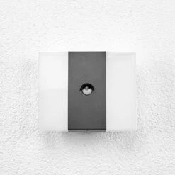 Ein Bewegungssensor befindet sich in der Mitte der LED-Außenwandleuchte Kumi, direkt auf der grafitgrau lackierten Blende. Dieser sorgt dafür, dass sich das Licht nur dann einschaltet, wenn sich Personen der Wandleuchte nähern und der Lichtschein tatsächlich benötigt wird. So kann ein unbequemes Ein- und Ausschalten vermieden werden, ebenso leuchtet Kumi nicht unnötig, ohne dass Personen anwesend sind. Der eckige Korpus der Leuchte besteht aus weißem Kunststoff und er sorgt dafür, dass ein angenehm abgeblendetes Licht entsteht.