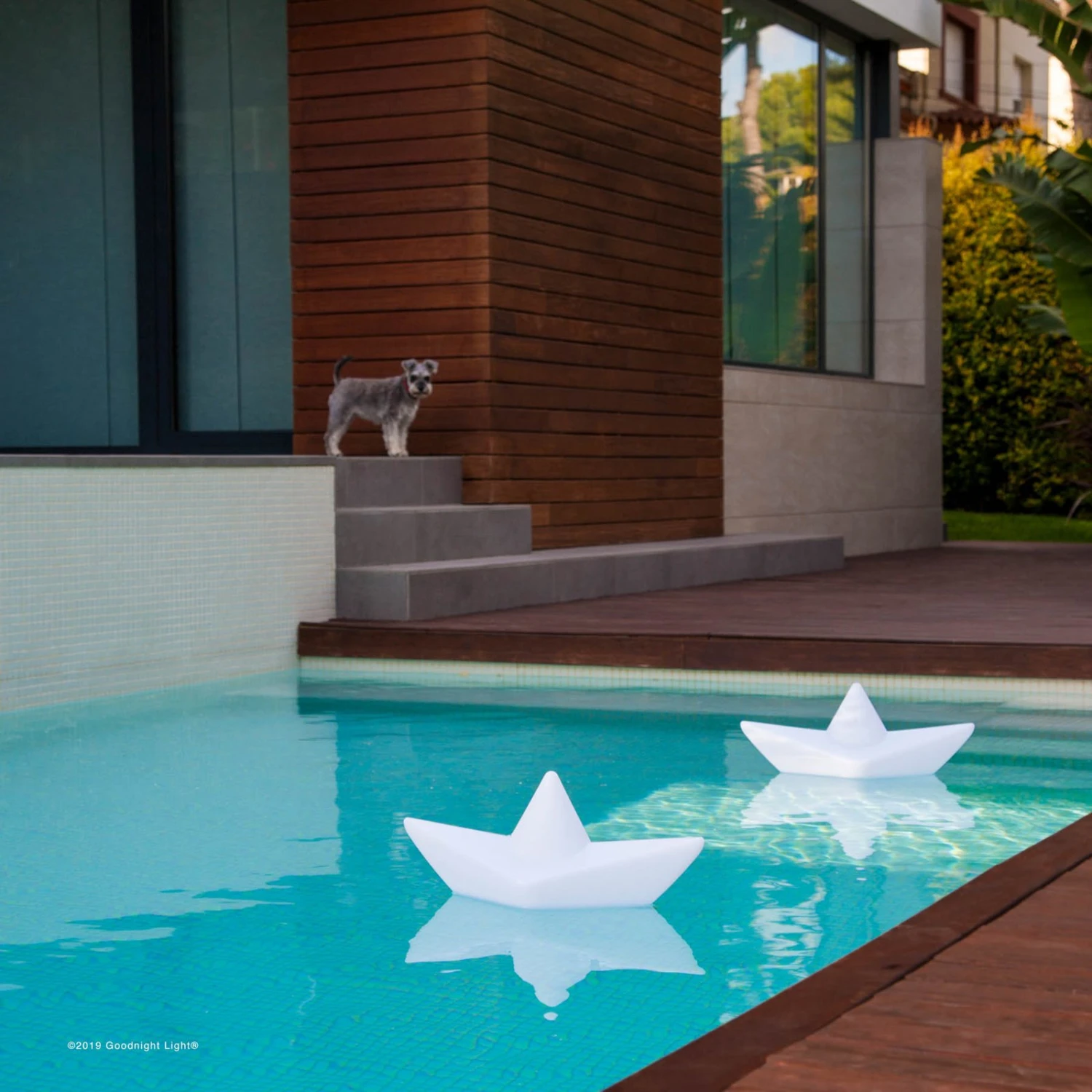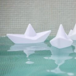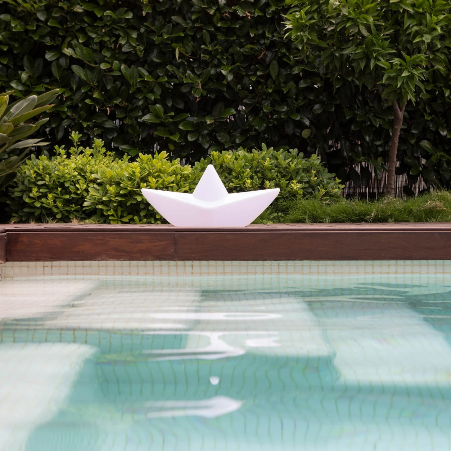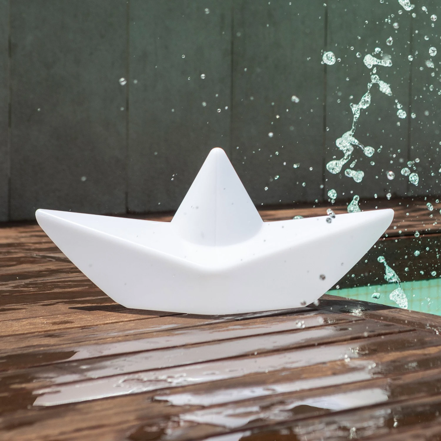 The BOAT Lamp™ ist eine Dekoleuchte aus hochwertigem, bruchfestem Kunststoff, die in ihrer Form an Papierschiffchen im Origami-Stil erinnert. Sie ist wasserdicht und schwimmfähig, wodurch sich die Leuchte vor allem zur stimmungsvollen Illumination von Teichen und Pools im Außenbereich eignet – dank der Korrosionsbeständigkeit auch bei Salzwasser. Sie ist dabei absolut flexibel, da sie mit ihrer kabellosen Akku-LED Technik von der mitgelieferten Induktionsladestation zu jedem gewünschten Platz transportiert werden kann. Das Laden erfolgt über ein USB-Kabel.