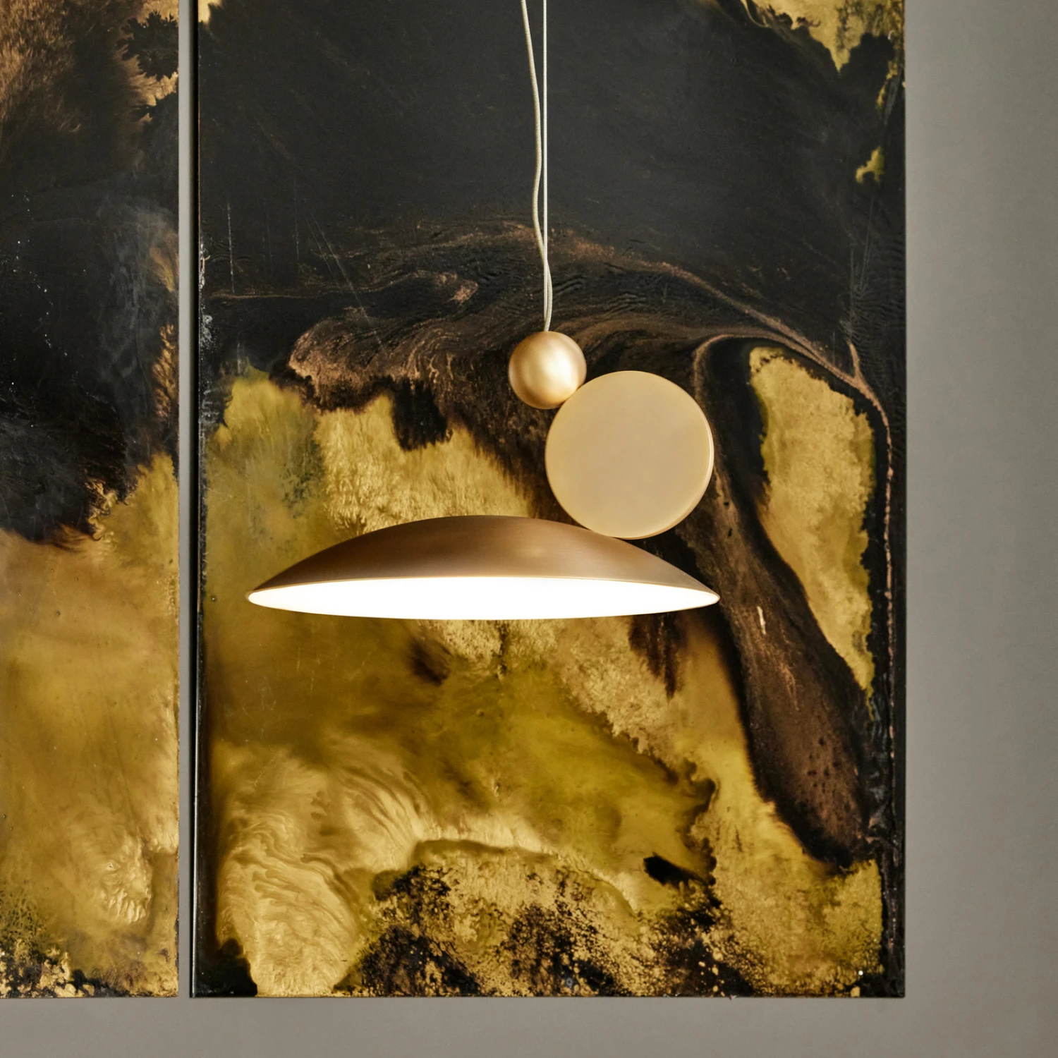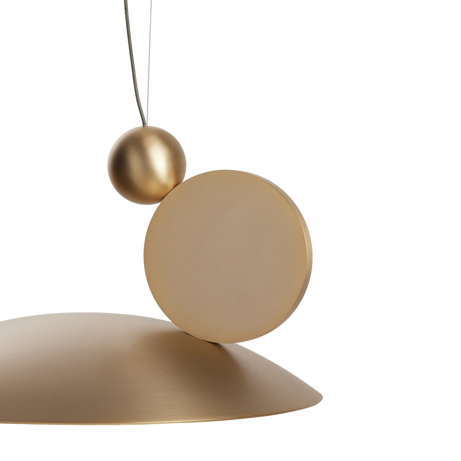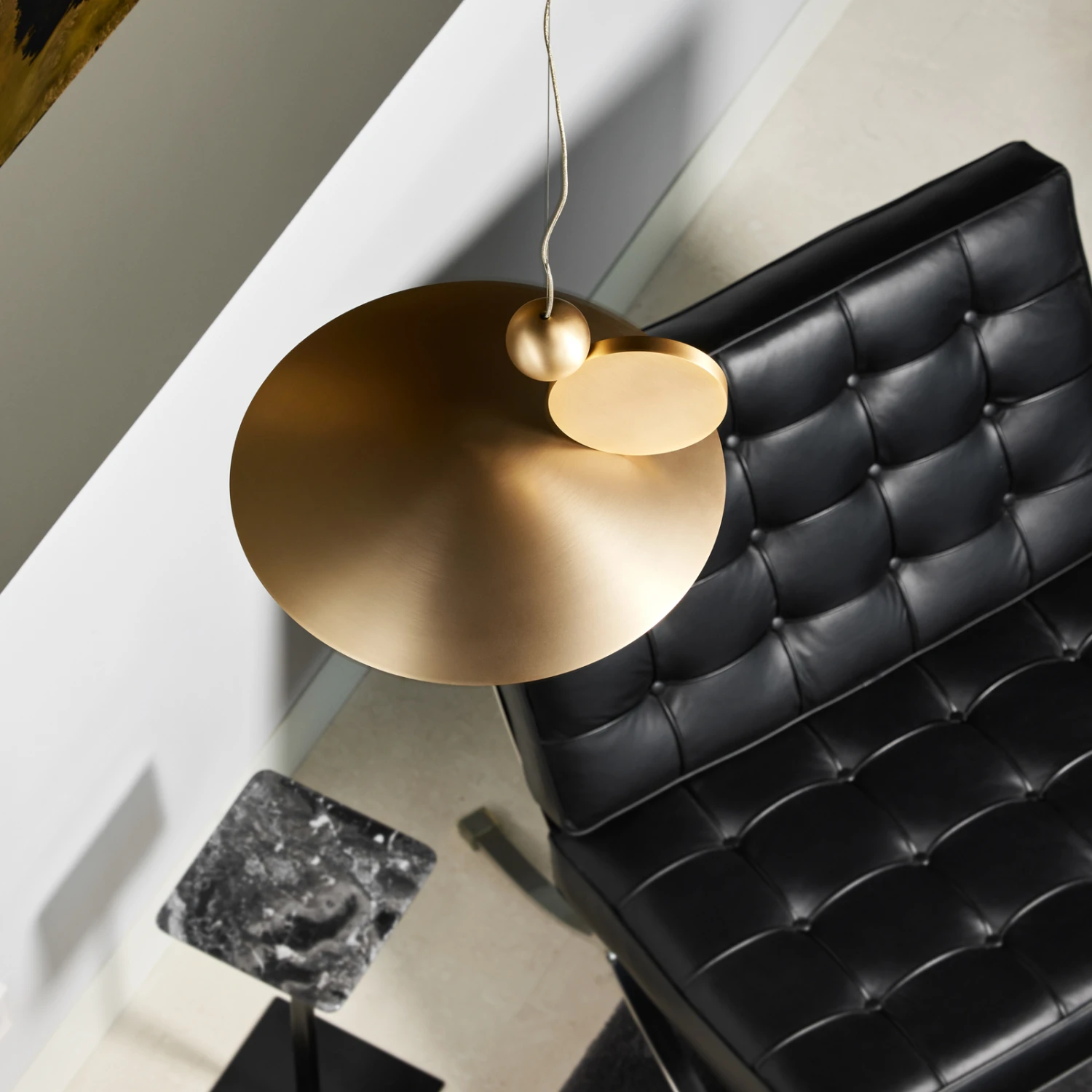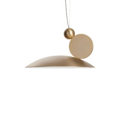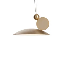Als Eyecatcher, der mit dem dezentral unter der Aufhängung platzierten Schirm sofort auffällt, präsentiert sich die LED-Hängeleuchte Equilibrium der Produkt- und Innendesignerin Jette Scheib. Drei Metallelemente, die versetzt untereinander stehen, prägen die Gestaltung: Eine obere, kleine Kugel, darunter eine etwas größere Halbkugel und schließlich der Schirm, welcher einen geringen Ausschnitt einer sehr großen Kugel darstellt. Die im Schirm integrierten LEDs emittieren warmweißes Licht, das sanft gestreut nach unten ausgestrahlt wird und bei Bedarf extern via Triac gedimmt werden kann. Equilibrium bietet sich nicht nur für Wohnräume, sondern auch für repräsentative Geschäftsräume und die Gastronomie an.