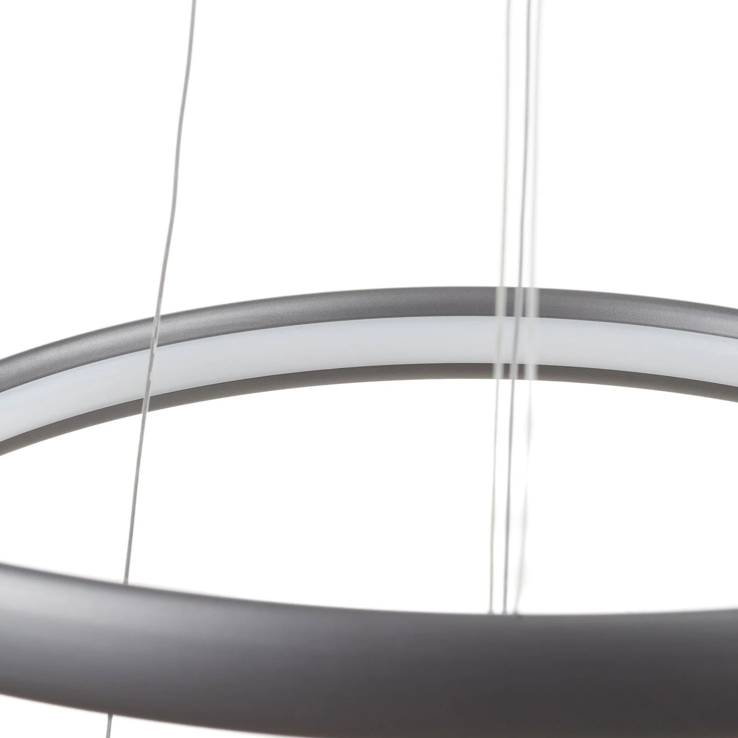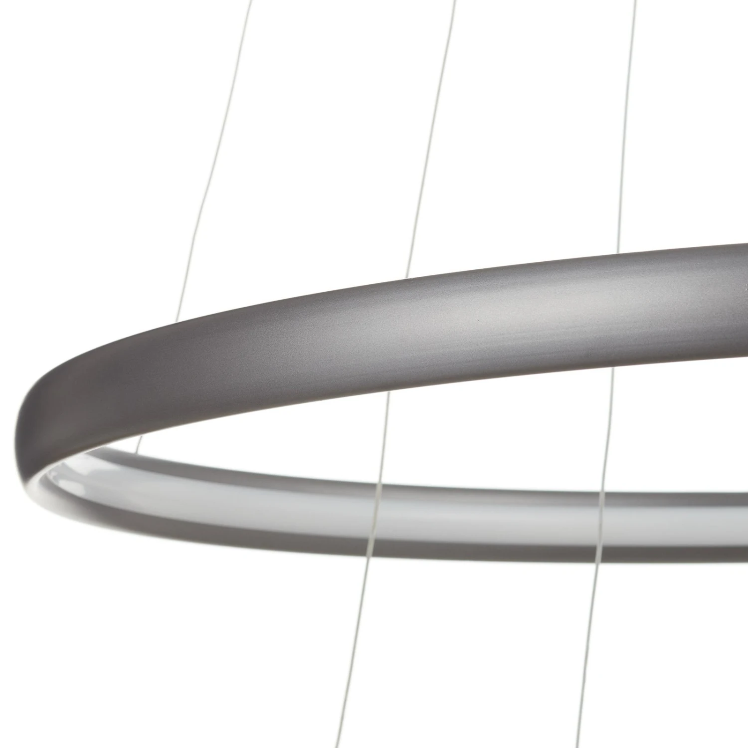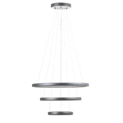 LED-Hängeleuchte Trinity – „Dreiheit“ zur aufregenden Beleuchtung Die LED-Hängeleuchte Trinity begeistert dank ihrer drei Metallringe aus Aluminium. Jeder Ring hat eine andere Größe. Sie sind pyramidenförmig, übereinander angebracht. Eine Vielzahl an filigranen Abhängungen befestigt die Ringe, wodurch sie fast zu schweben scheinen. Damit wird der Leuchte eine spielerische Leichtigkeit verliehen. Die LEDs sind jeweils an der Innenseite der Metallringe angebracht und durch eine satinierte Acryl-Abdeckung geschützt. Da die LEDs sich auf der Innenseite befinden wird der Raum indirekt beleuchtet und das Licht reflektiert sich gegenseitig. Zusätzlich wird das Licht durch die Acryl-Abdeckung gedämpft, wodurch für eine gemütliche Beleuchtung gesorgt wird. Die Leuchte findet wunderbar Platz im Eingangsbereich oder großen Räumen mit hohen Decken. Auch der Einsatz in öffentlichen / gewerblichen Bereichen ist denkbar.