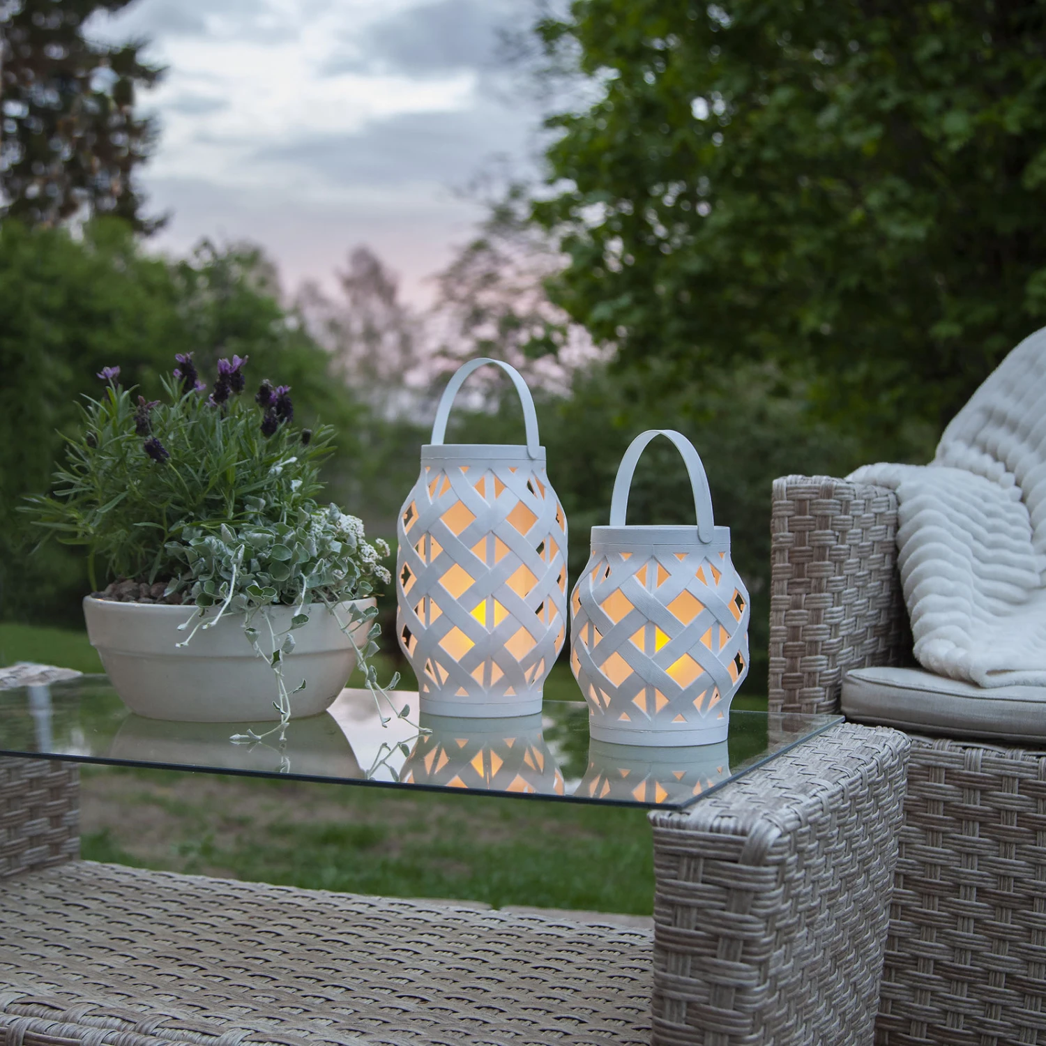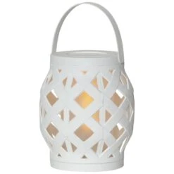 Besonders stimmungsvoll und dekorativ wirkt die LED-Laterne Flame Lantern. Die Außenhülle aus Kunststoff ist ein Geflecht mit vielen Zwischenräumen, die den Blick auf den inneren Diffusor gewähren. Dieser gleicht optisch einer Kerze und die darin verbauten LEDs imitieren einen Flammeneffekt. Flame Lantern wird mit drei AAA Batterien betrieben (nicht enthalten – siehe Zubehör) und verfügt über einen praktischen Tragegriff an der Oberseite, wodurch sie absolut mobil ist. Man kann die LED-Dekoleuchte entweder im Innenbereich oder im geschützten Außenbereich einsetzen und stimmungsvolle Momente zaubern. Über die Timerfunktion kann mithilfe des integrierten Schalters Dauerlicht oder Licht für sechs Stunden eingeschaltet werden. Auch schaltet man sie darüber aus.