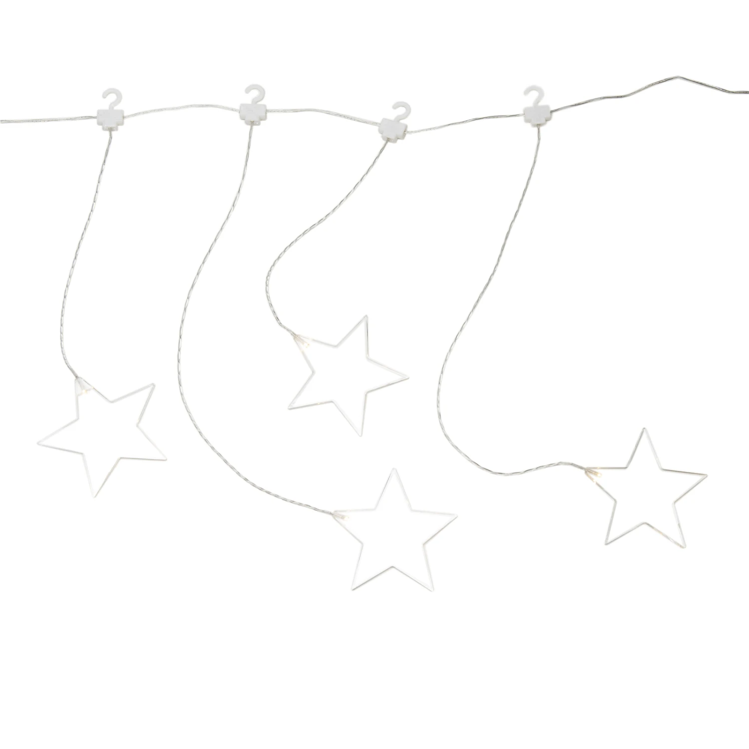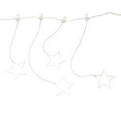 Der LED-Lichtervorhang eignet sich für die Nutzung im Innenbereich, beispielsweise vor einem Fenster: Er ist mit acht durchsichtigen Sternen aus Kunststoff bestückt, die unterschiedlich hoch aufgehängt sind. Die Sterne werden durch warmweiße LEDs illuminiert.