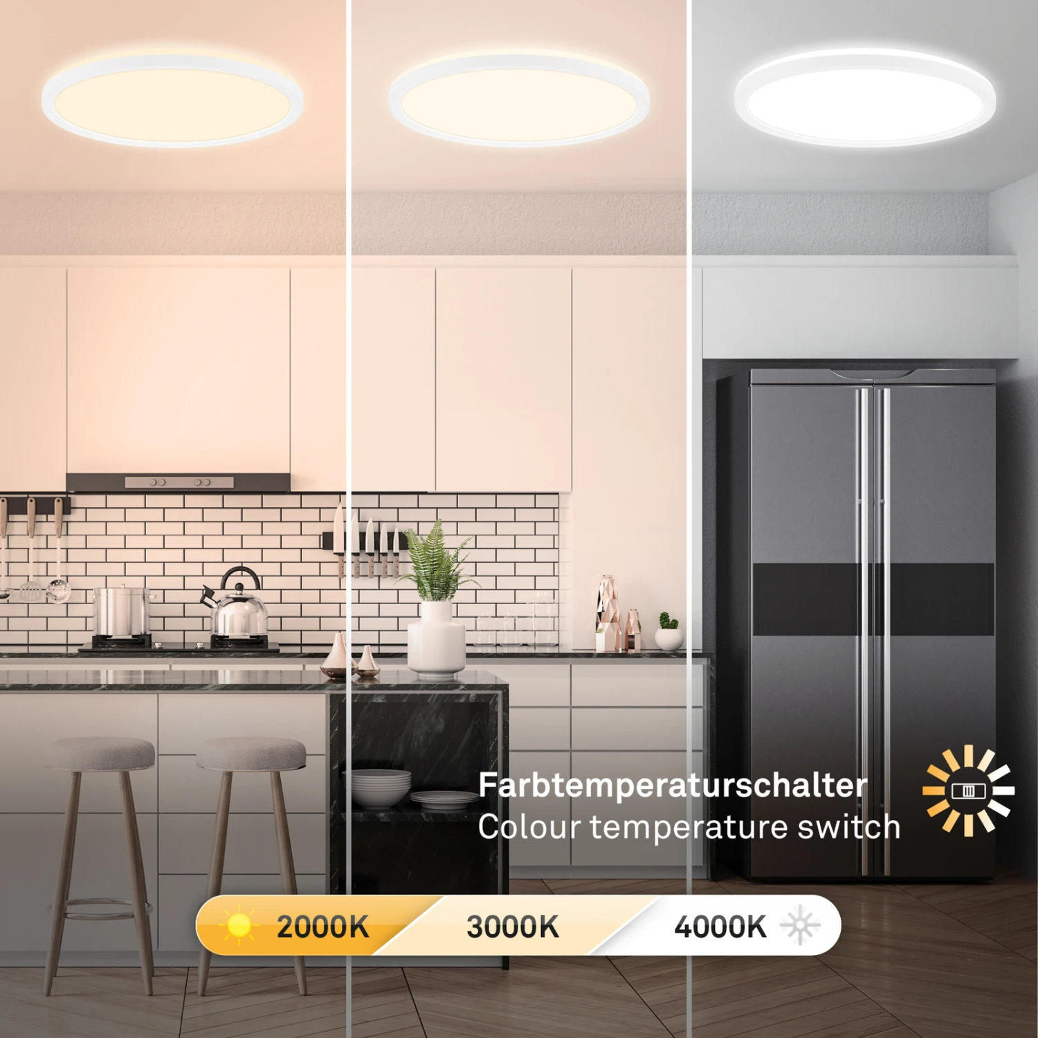Das runde, sehr flache LED-Panel 7555/7557 besteht aus Kunststoff und bietet drei verschiedene Lichtfarben, die je nach Einsatzort und persönlicher Vorliebe gewählt werden können. Über einen Schalter auf der Rückseite des Panels lässt sich die Lichtfarbe einstellen. Der satinierte Diffusor gewährleistet eine gleichmäßige Lichtabstrahlung.