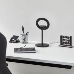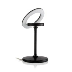 Die kleine, moderne Schreibtischleuchte Filigree verfügt über einen 355° drehbaren und 90° schwenkbaren Lichtring, der von einem runden Standrohr getragen wird und über ein innovatives Wärmemanagement mit Passivkühlung verfügt. Die LEDs strahlen warmweißes Licht durch opalweißes Acryl in den Raum. Das Schalten und Dimmen erfolgt über einen Touch-Sensor am Standrohr.