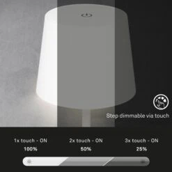Stimmungsvolle, warmweiße Beleuchtung, völlig ohne lästiges Kabel bietet die LED-Tischleuchte Piha dank des integrierten Akkus. Mit IP44 vor Spritzwasser und Schmutz geschützt, lässt sie sich auch draußen aufstellen und sorgt für gemütliches Licht auf der Terrasse, dem Balkon und sogar entlegenen Bereichen im Garten. Durch mehrmaliges Berühren oben am Schirm kann die Lichtstärke in drei Helligkeitsstufen geschaltet werden.