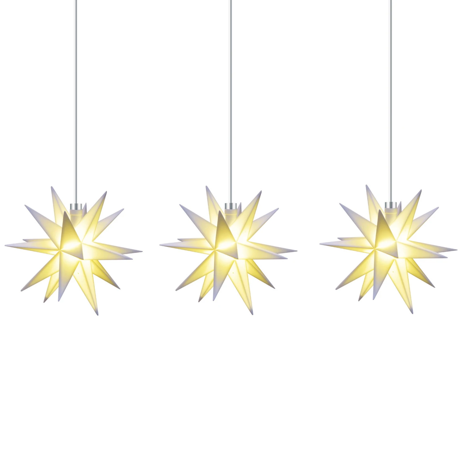 Die LED-Lichterkette Stern ist mit drei kleinen, 18-zackigen Sternen aus Kunststoff geschmückt, die aufgrund ihrer schönen Form wie ein Blickmagnet wirken. Mit der batteriebetriebenen Lichterkette lässt sich in jedem Raum im Handumdrehen ein weihnachtliches Ambiente kreieren, ohne dass ein Stromanschluss in der Nähe sein muss.
