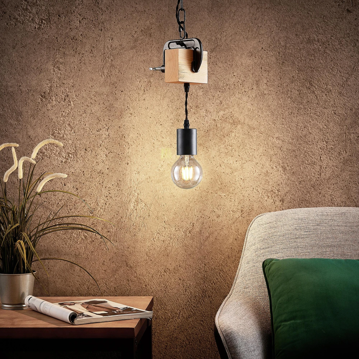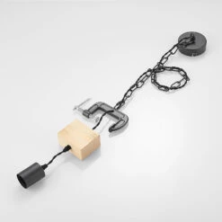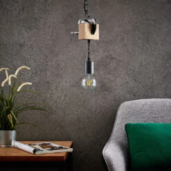 Die Hängelampe Asya präsentiert sich mit ihrem ganz eigenen Charme. Sie besteht aus robustem Eisen und Holz und die Farbkombination aus Schwarz und Eiche verleihen ihr ein attraktives Äußeres. An einer runden Deckenhalterung ist eine Eisenkette befestigt, an deren Ende ein Holzbalken angebracht ist. Dieser Holzbalken hält eine Befestigung in Schraubstockoptik und eine nach unten hängende Fassung, welche mit passenden Leuchtmitteln bestückt werden kann. Am besten eignet sich ein Filament-Leuchtmittel, das der Leuchte ein noch beeindruckenderes Aussehen ermöglicht. Das schlanke Design der Hängeleuchte Asya lässt sich sogar in kleineren Räumen anbringen und erzeugt ein gemütliches Landhaus-Flair mit zugleich dem Charme eines industriellen Stils. Eine besonders gute Figur macht die Leuchte in einem Wohnzimmer und wertet den Einrichtungsstil dort wohlwollend auf.