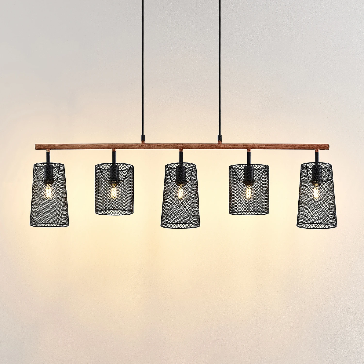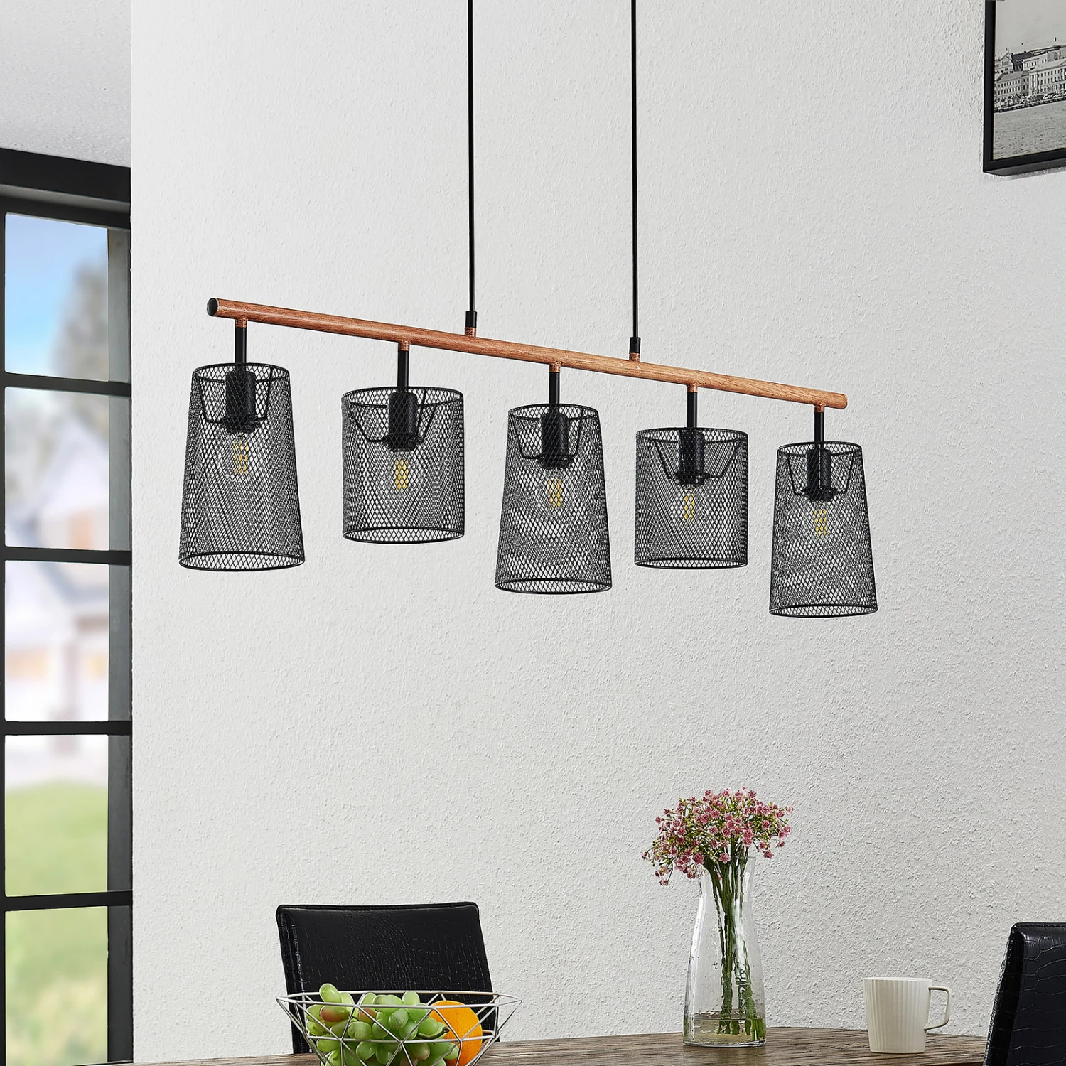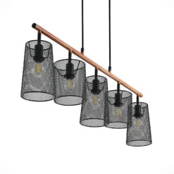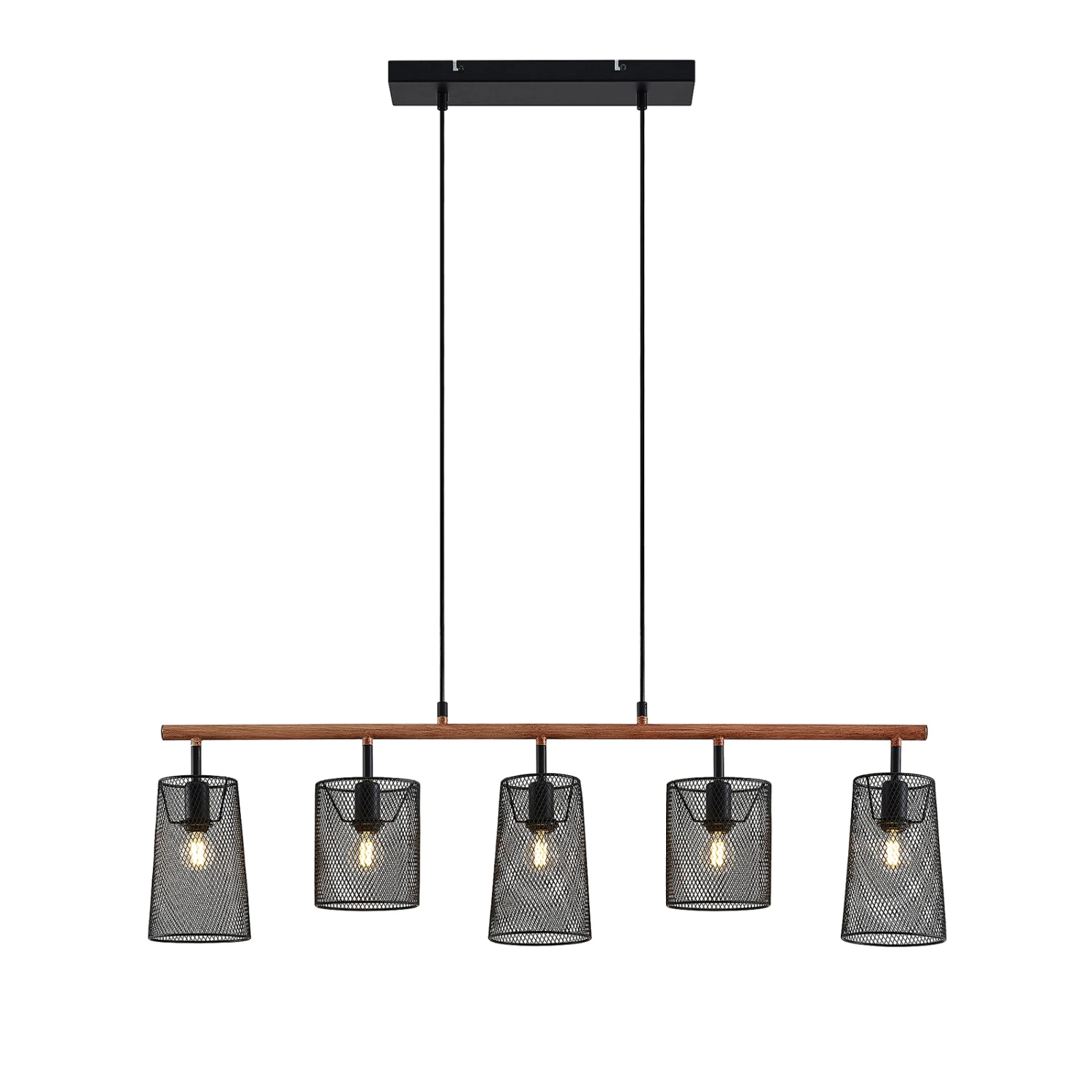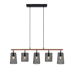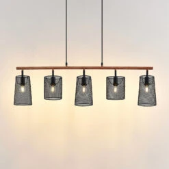 Die Hängeleuchte Bitana sticht durch ihr spannendes und vielfältiges Aussehen heraus. Sie besteht aus einer länglichen Strebe, an der fünf Leuchtenschirme aus Stahl angebracht sind, die mit ihrem Aussehen an Käfige erinnern. Durch das Einsetzen der richtigen Leuchtmittel, wird eine ausgiebige Ausleuchtung gewährleistet und durch die Lücken innerhalb der Käfigstreben entsteht ein interessantes Lichtspiel. Die Farbkombination aus Holz und Schwarz geben ihr einen attraktiven Kontrast und stimmen ihr Gesamtbild ab. Die Hängeleuchte Bitana ist durch ihr markantes oder modernes Design mühelos in moderne Einrichtungsstile integrierbar und macht vor allem in Wohn- oder Esszimmern eine gute Figur. Ihre imposante Größe machen sie zu einem Hingucker und verwandelt jeden Raum in etwas Besonderes.