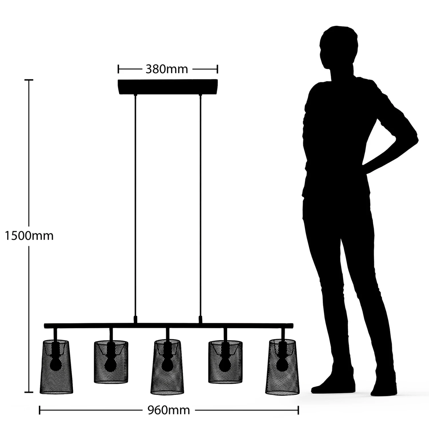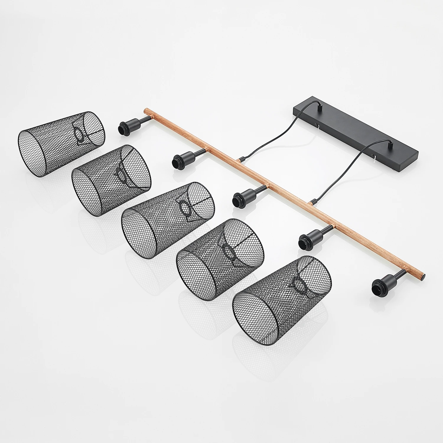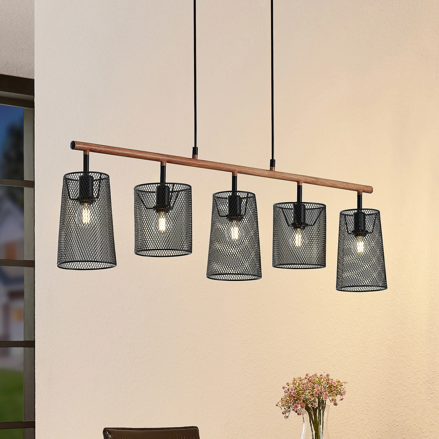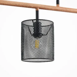 Die Hängeleuchte Bitana sticht durch ihr spannendes und vielfältiges Aussehen heraus. Sie besteht aus einer länglichen Strebe, an der fünf Leuchtenschirme aus Stahl angebracht sind, die mit ihrem Aussehen an Käfige erinnern. Durch das Einsetzen der richtigen Leuchtmittel, wird eine ausgiebige Ausleuchtung gewährleistet und durch die Lücken innerhalb der Käfigstreben entsteht ein interessantes Lichtspiel. Die Farbkombination aus Holz und Schwarz geben ihr einen attraktiven Kontrast und stimmen ihr Gesamtbild ab. Die Hängeleuchte Bitana ist durch ihr markantes oder modernes Design mühelos in moderne Einrichtungsstile integrierbar und macht vor allem in Wohn- oder Esszimmern eine gute Figur. Ihre imposante Größe machen sie zu einem Hingucker und verwandelt jeden Raum in etwas Besonderes.