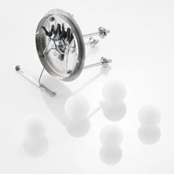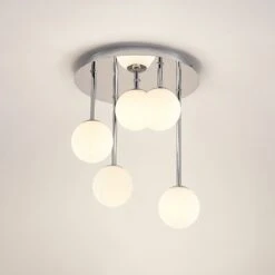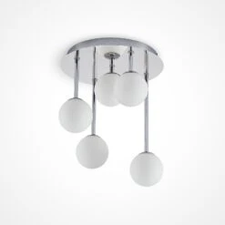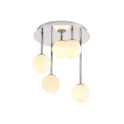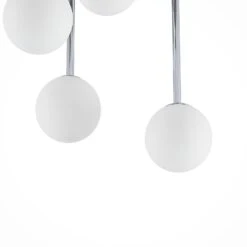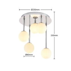 Die moderne Deckenleuchte Chrissy besitzt einen runden Baldachin aus chromfarben glänzendem Metall. Von dort aus gehen fünf unterschiedliche lange Elemente nach unten, an deren Ende ein Lampenschirm aus Glas angebracht ist. Dieser ist jeweils in einer schönen Kugelform gearbeitet und gibt das Licht zu allen Seiten hin blendfrei und gleichmäßig ab. Die Leuchte Chrissy ist als Deckenbeleuchtung zum Beispiel für das Wohnzimmer oder den Flur gut geeignet.