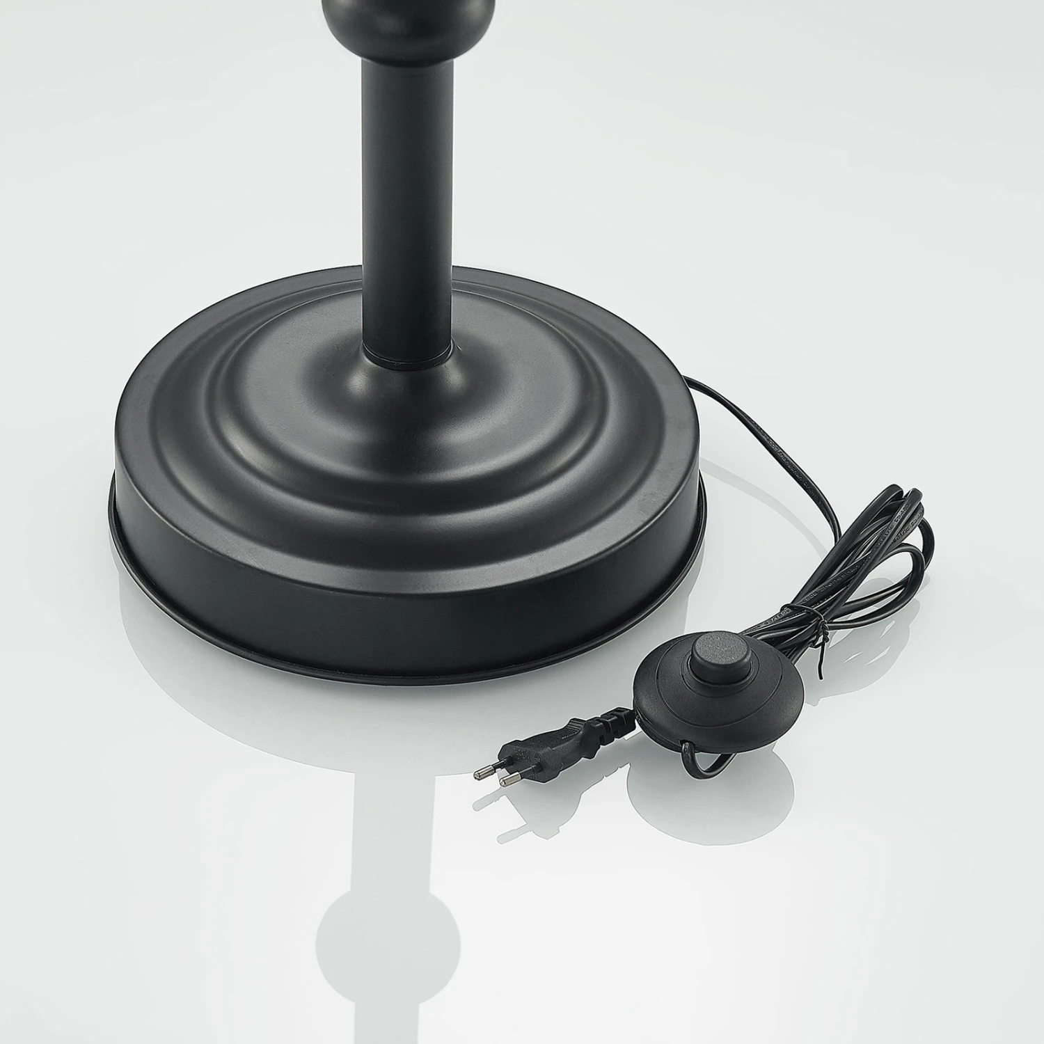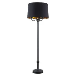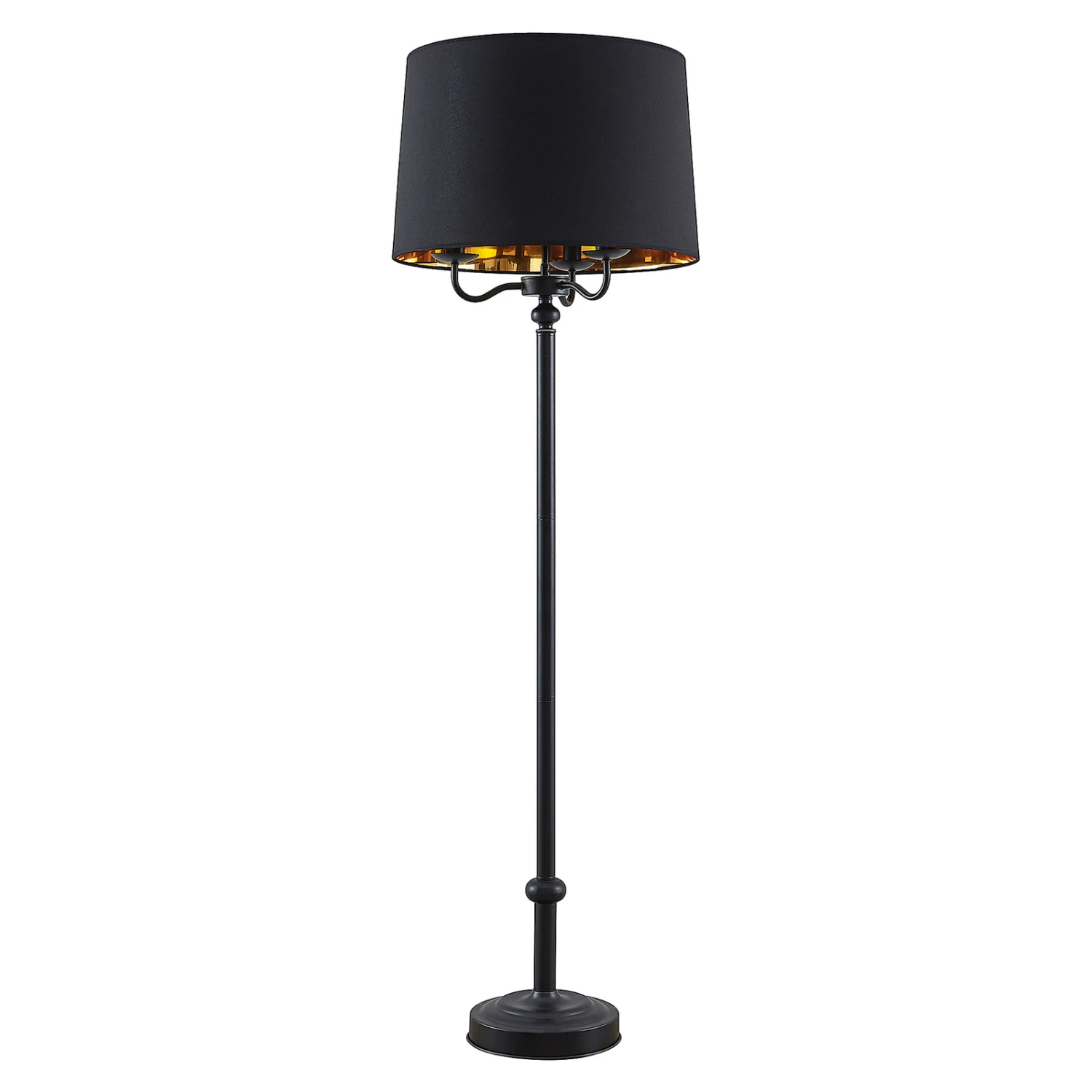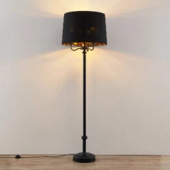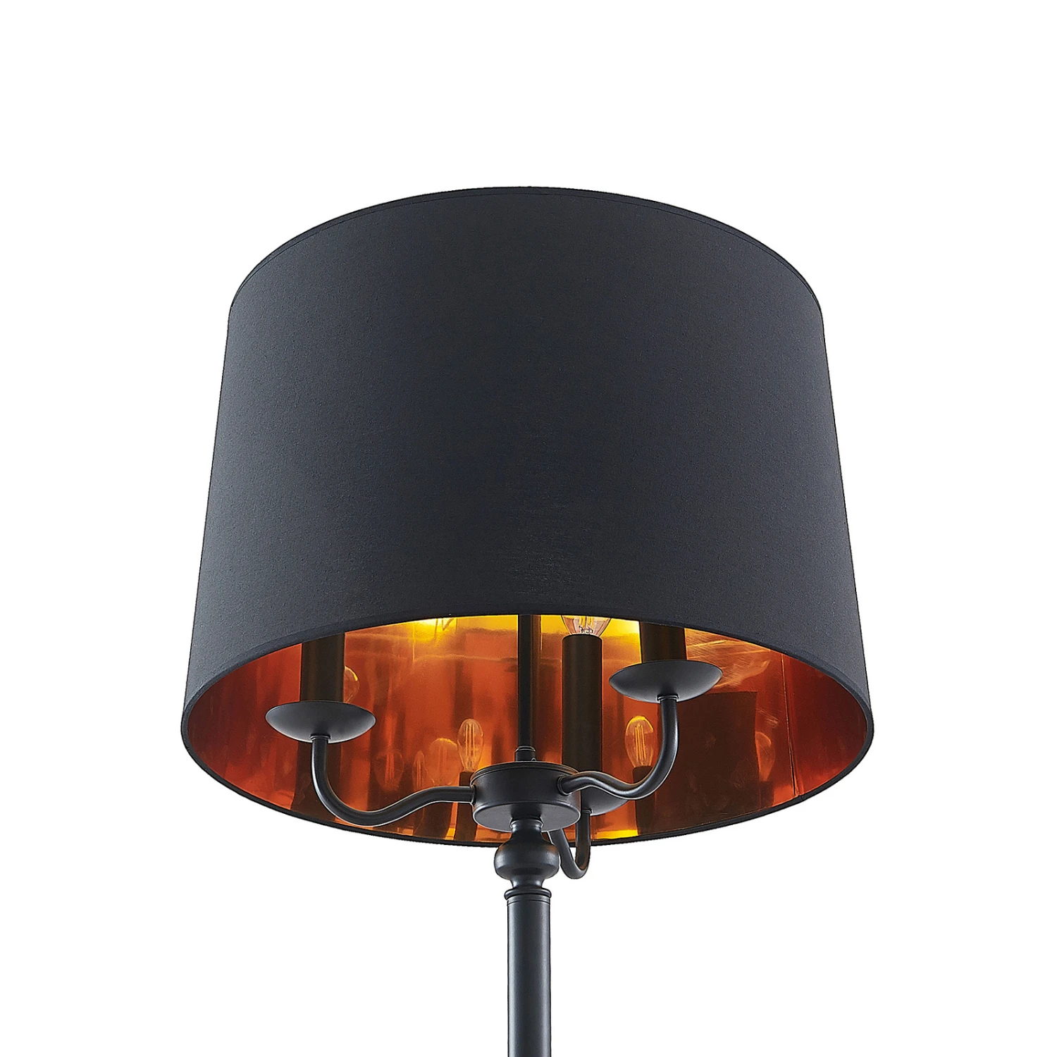 Dekorativ, edel und mit einer sehr schönen Lichtwirkung – die Stehleuchte Christer weiß in vielerlei Hinsicht zu begeistern. Das mattschwarze Gestell der Leuchte besteht aus Eisen und ist oben wie ein dreiarmiger Leuchter gestaltet. Ein schwarzer Textilschirm mit goldfarben beschichteter Innenseite umgibt die Leuchtmittel und lässt das Licht sanft hindurchstrahlen, während es durch die Öffnungen des Schirms nach oben und unten mit einem warmen Schimmer strahlt. Geschaltet wird die Leuchte über den im Zuleitungskabel integrierten Fußschalter.