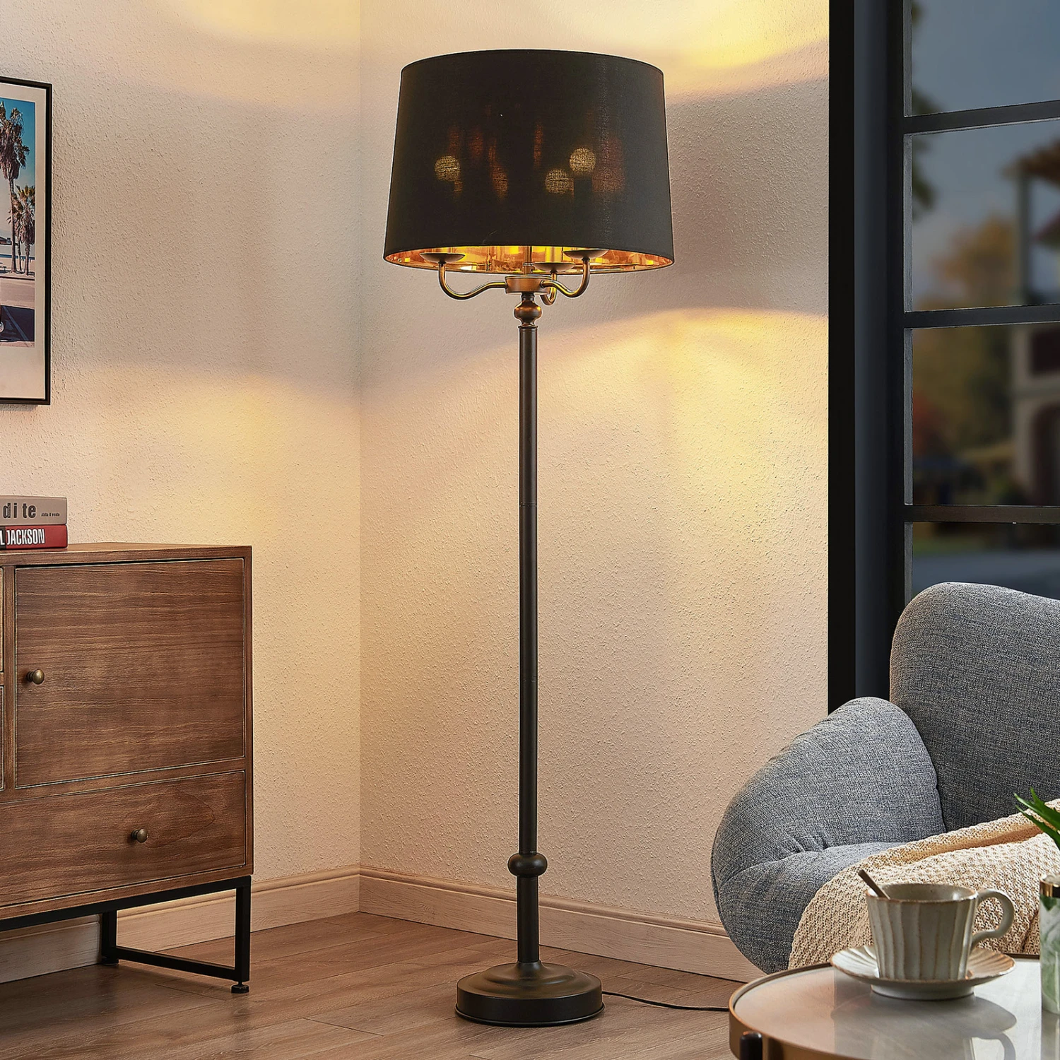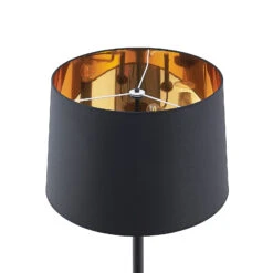 Stehleuchte Christer mit weitem Textilschirm in Schwarz und Gold