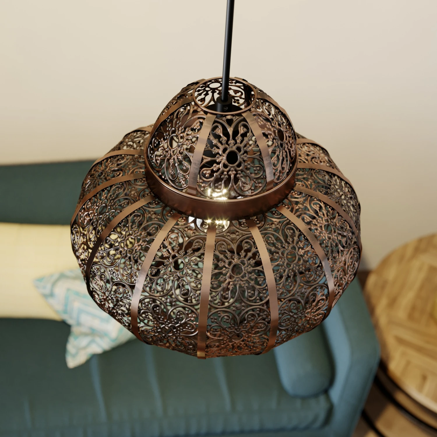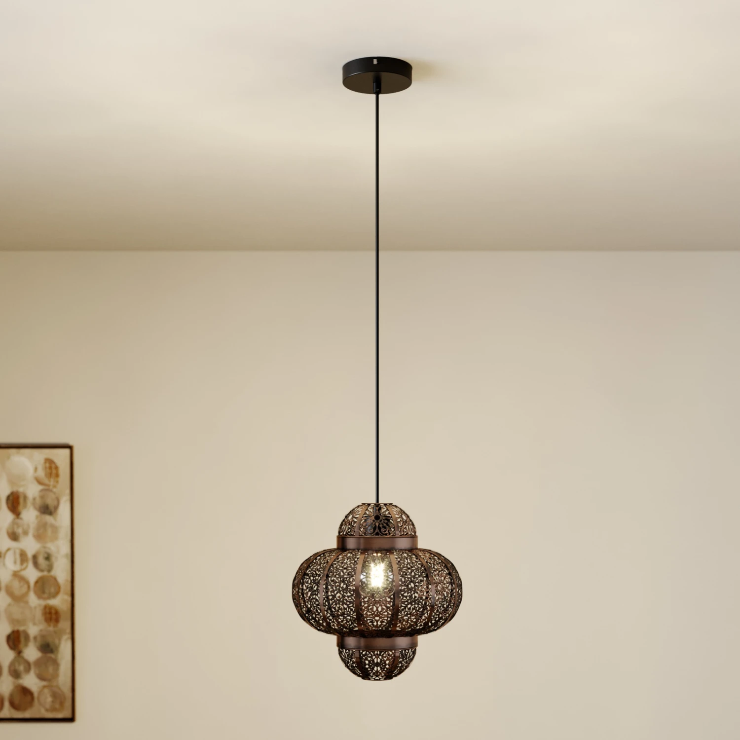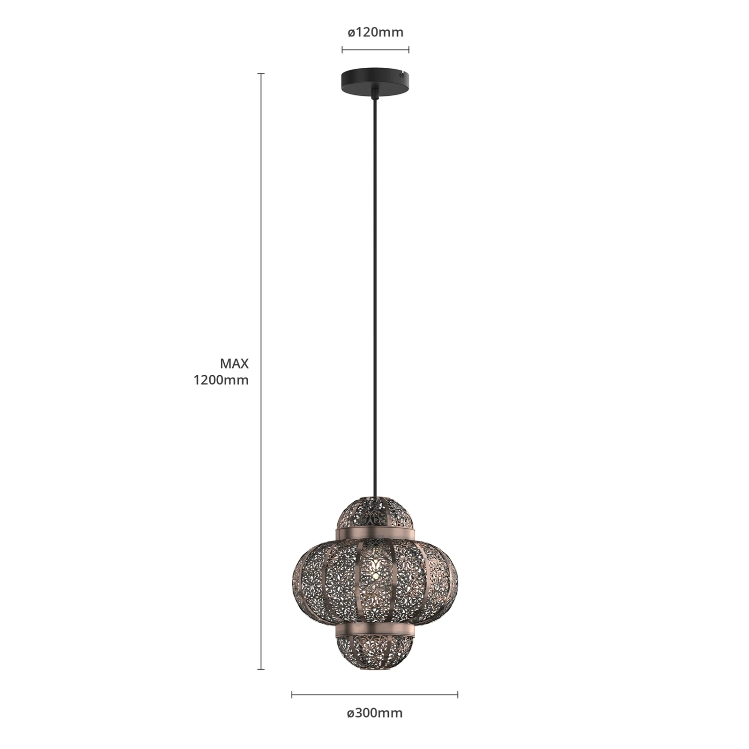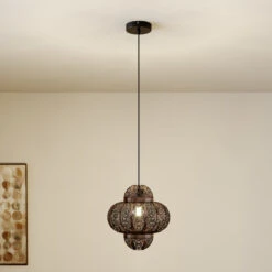 Die Hängeleuchte Darlia bringt den Flair des Orients ins heimische Wohnzimmer. Der Lampenschirm ist mit einem detailreichen Lochmuster versehen. Dieses verleiht der Leuchte nicht nur ihren einzigartigen Charme, sondern kreiert gleichzeitig romantische Lichtmomente. Das Muster sorgt für ein zauberhaftes Zusammenspiel aus Licht und Schatten, welches sich künstlerisch auf den Wänden ausbreitet. Der fein gearbeitete Schirm besteht aus Metall und wurde in einer tollen Bronzefarbe gehalten. Darlia ist wirklich etwas Besonderes – diese Leuchte ist Dekorationselement und Lichtquelle in einem.