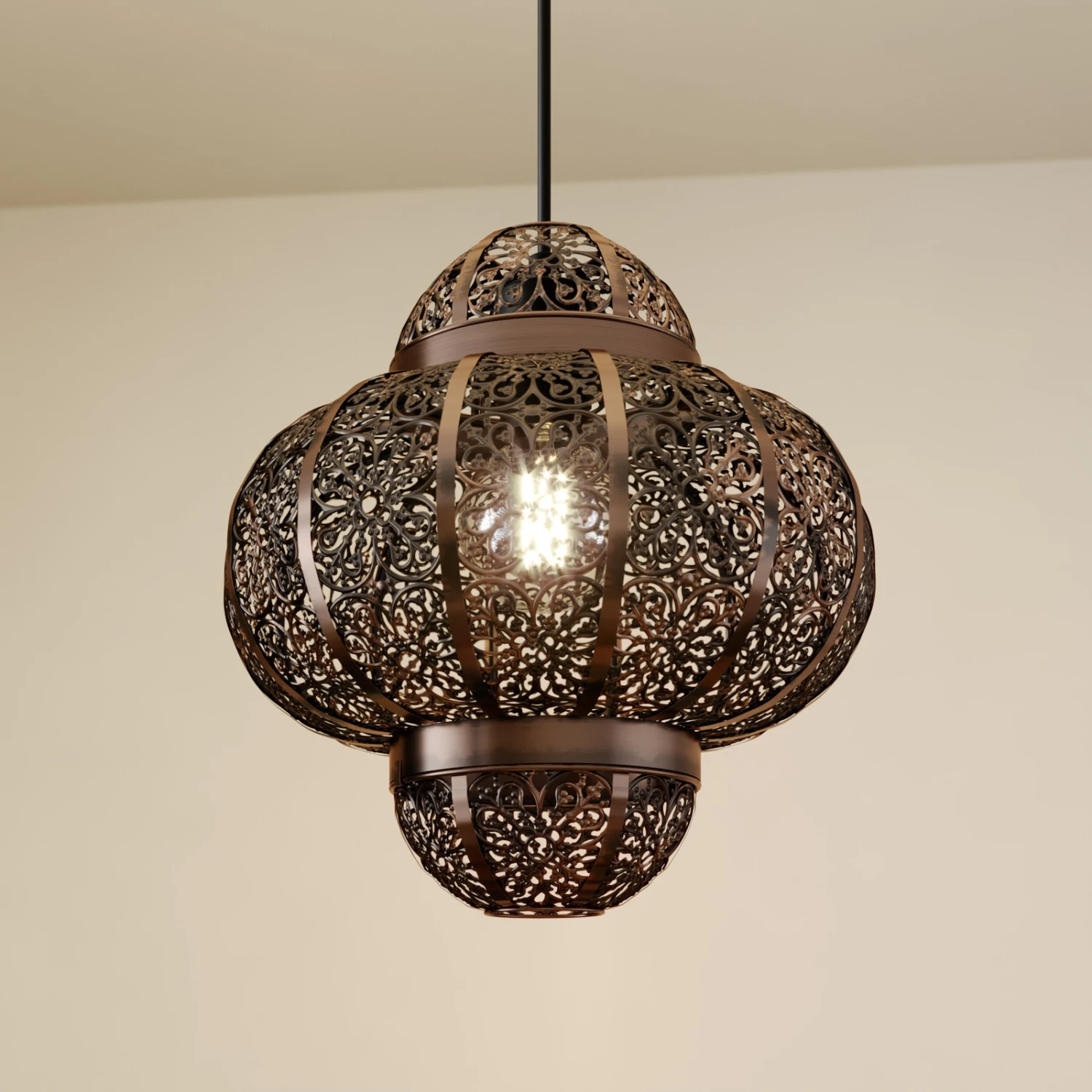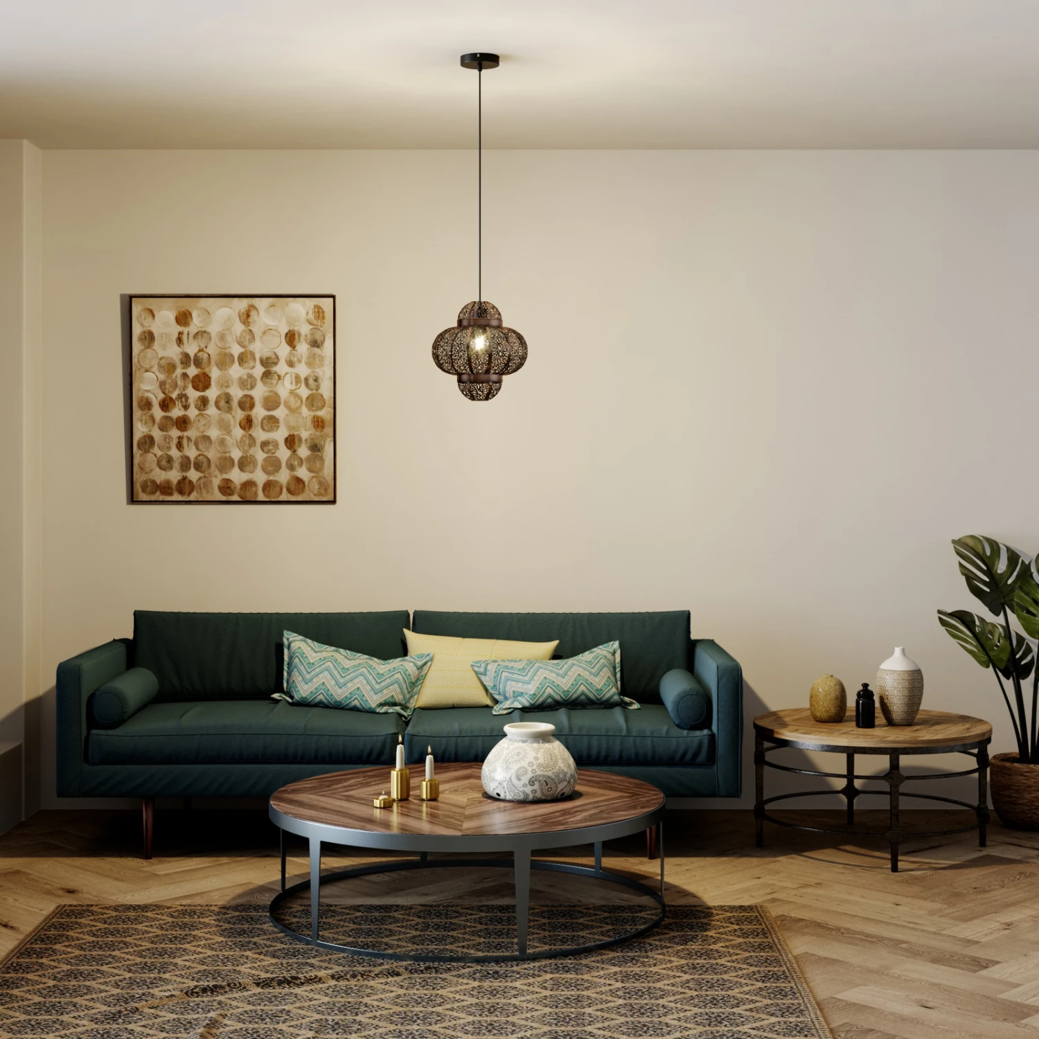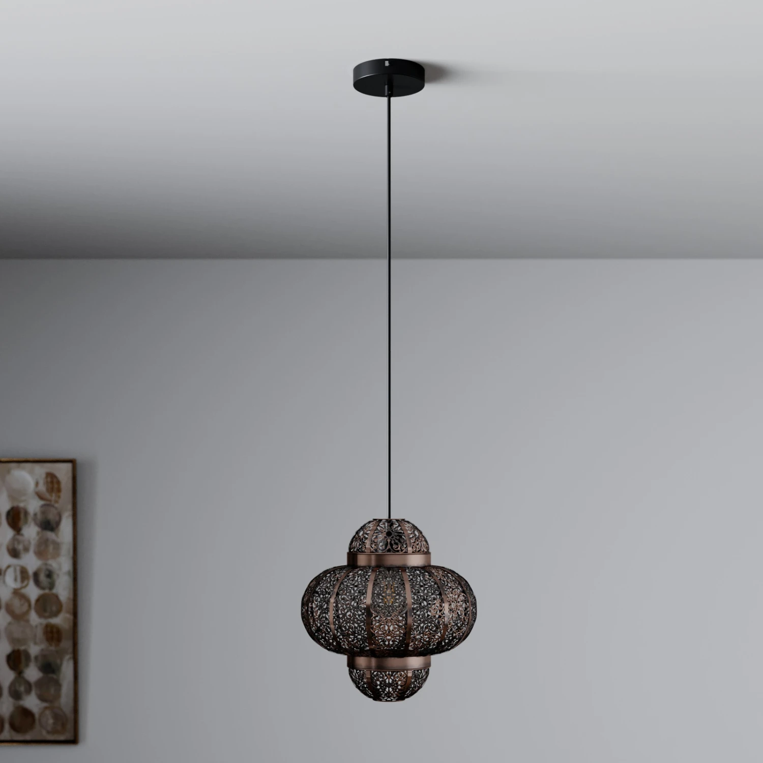 Die Hängeleuchte Darlia bringt den Flair des Orients ins heimische Wohnzimmer. Der Lampenschirm ist mit einem detailreichen Lochmuster versehen. Dieses verleiht der Leuchte nicht nur ihren einzigartigen Charme, sondern kreiert gleichzeitig romantische Lichtmomente. Das Muster sorgt für ein zauberhaftes Zusammenspiel aus Licht und Schatten, welches sich künstlerisch auf den Wänden ausbreitet. Der fein gearbeitete Schirm besteht aus Metall und wurde in einer tollen Bronzefarbe gehalten. Darlia ist wirklich etwas Besonderes – diese Leuchte ist Dekorationselement und Lichtquelle in einem.