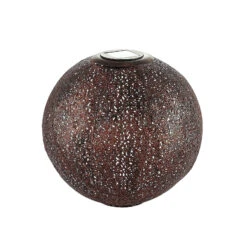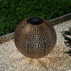 Leuchten im orientalischen bzw. marokkanischen Look erfreuen sich immer größerer Beliebtheit, inzwischen auch im Außenbereich. Diese LED-Solarleuchte hat einen Leuchtenkorpus aus Metall in Form einer Kugel, die über und über mit einem schmuckvollen Ornamentmuster verziert ist. Perfekt zur Gesamtoptik passend ist die Oberfläche in einem antik amutenden Kupferton gehalten. Das Licht strahlt zu allen Seiten weg und natürlich bildet sich das Ornamentmuster auch in der gesamten Umgebung ab, was außerordentlich kunstvoll aussieht und auch einen gewissen Glamour verkörpert.