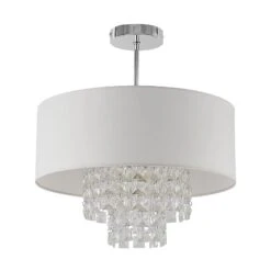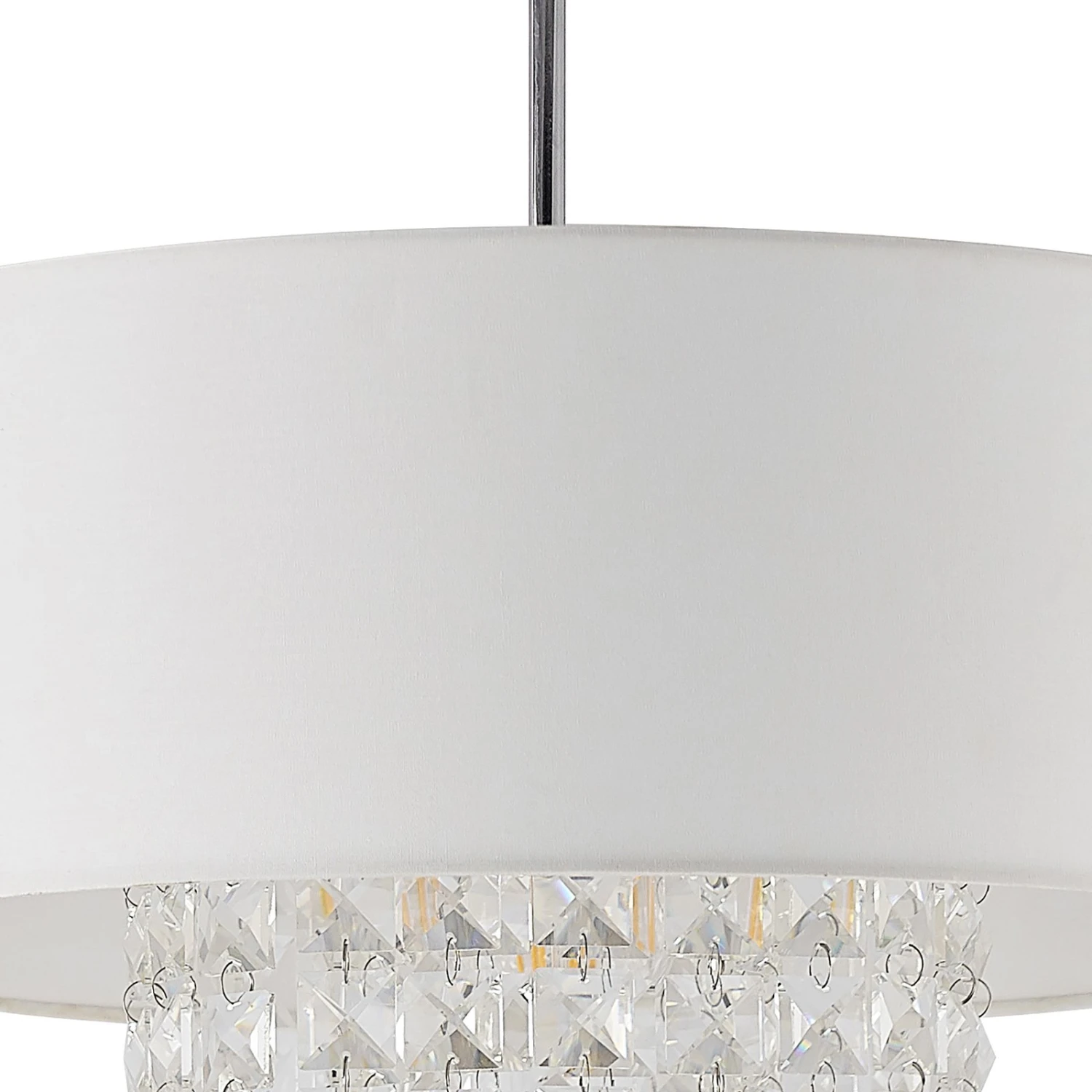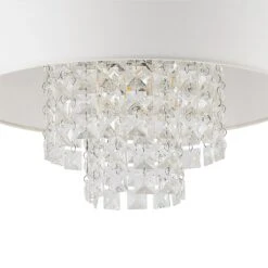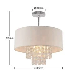 Die Deckenleuchte Estera besteht aus einem mit etwas Abstand von der Decke angebrachtem Lampenschirm, der aus weißem, stoffbezogenem Kunststoff gefertigt ist. Das chromfarbene Gestell und der ebenfalls chromglänzende Baldachin bilden mit dem weißen Schirm und den transparenten Glassteinen einen zauberhaften Kontrast. Die Steine hängen in der Mitte des Schirms an unterschiedlich langen Strängen und sorgen für die Eleganz und die wunderschöne Lichtwirkung, die beim Einschalten entsteht. Estera ist als Deckenleuchte zum Beispiel im Schlaf- oder Wohnzimmer perfekt geeignet, kann aber auch den Eingangsbereich sowie Flure wunderbar in Szene setzen.