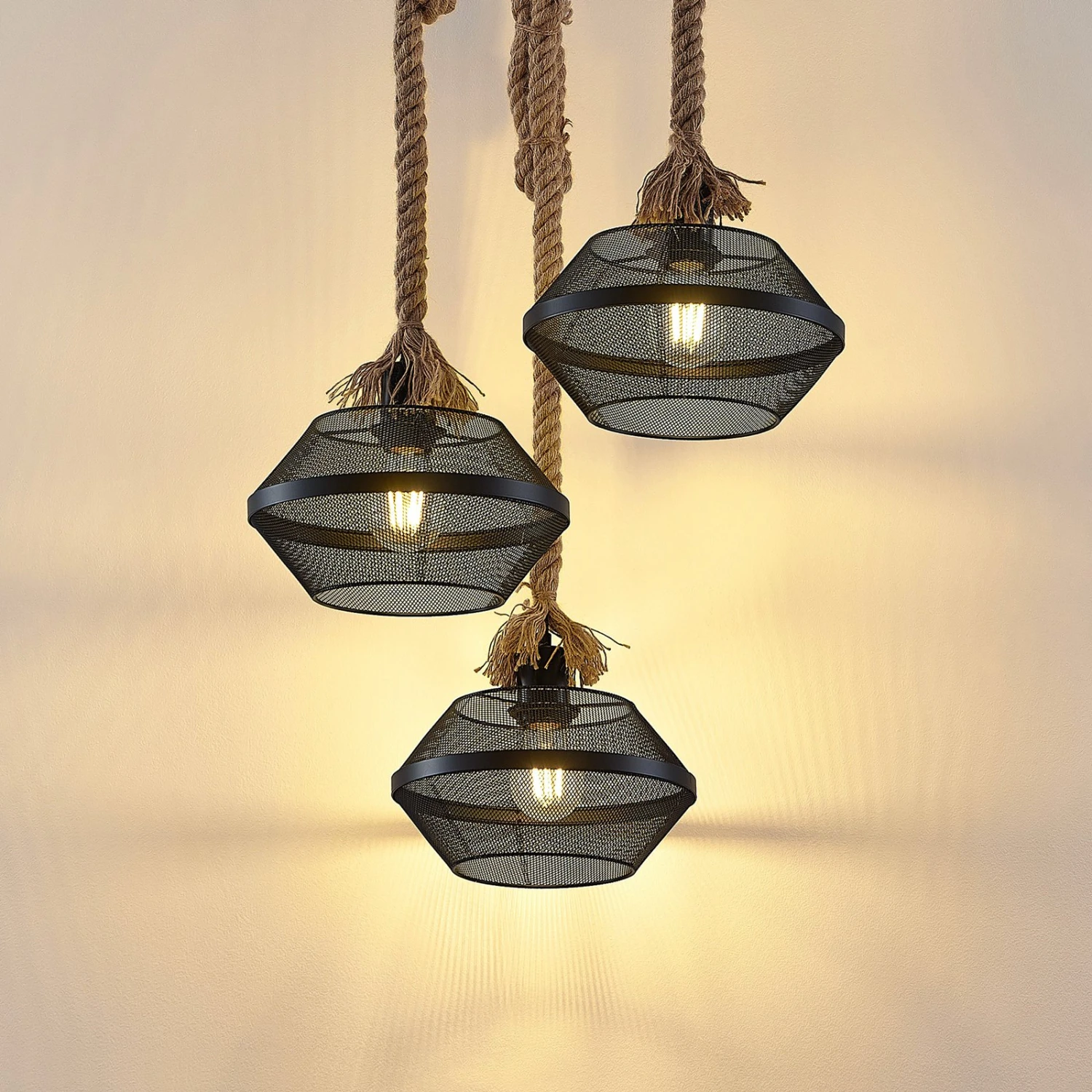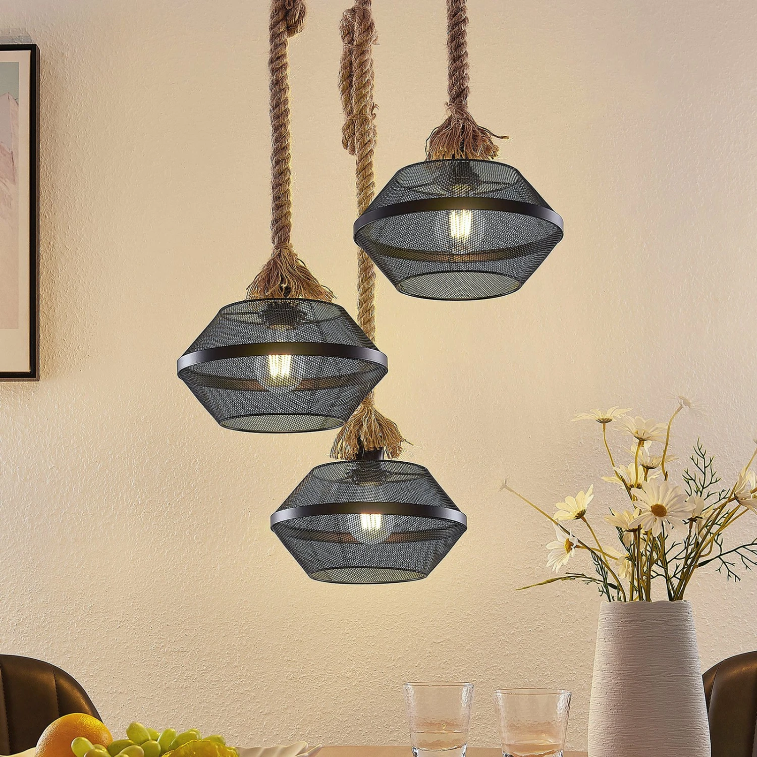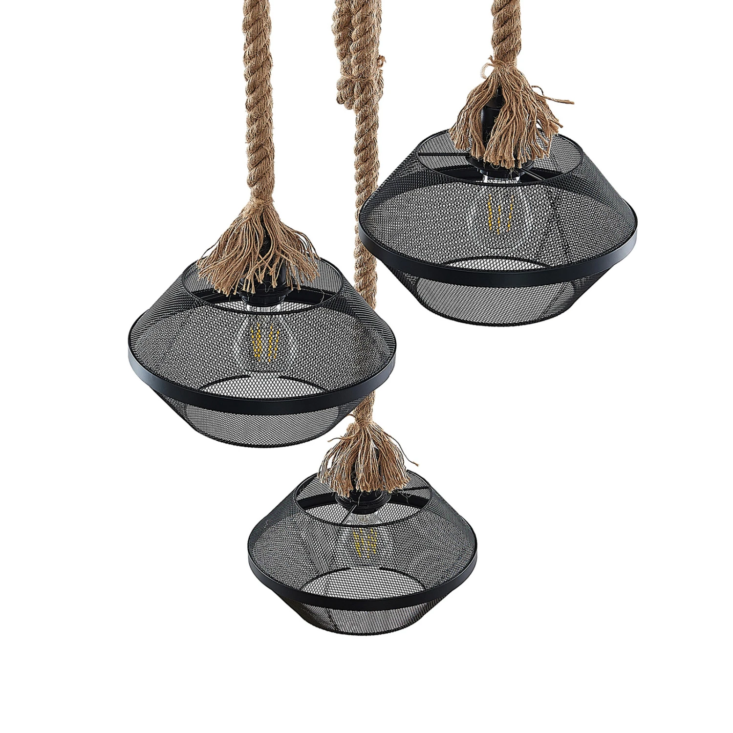Die Hängelampe Rabia zieht alle Blicke auf sich. An ihrer Deckenhalterung sind drei Taue aus Hanfseil befestigt, an denen jeweils ein Leuchtenschirm hängt, die optisch an einen Käfig erinnern. Für den besonderen Effekt, wurden die Schirme an unterschiedlich langen Seilen befestigt und sind somit stufenweise angebracht. Das erzeugte Licht der einzusetzenden Leuchtmittel wird durch die Lücken innerhalb der Schirme gebrochen und generiert ein spannendes Lichtspiel. Mit ihrem interessanten Aussehen, macht die Hängeleuchte Rabia aus jedem Raum etwas ganz Besonderes. Mit ihrem rustikalen und abwechslungsreichen Design, wertet sie jeden Einrichtungsstil wohlwollend auf und ist ein überzeugender Dekorationsgegenstand.
